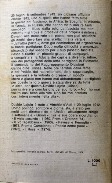 Soggetti: Letteratura, Narrativa contemporanea, Romanzi autobiografici, Libri vintage, Fuori catalogo, Biografie, Storia contemporanea, Romanzo storico, Armistizio, 8 Settembre, Fascismo, Nazismo, Resistenza, Partigiani, Lotta partigiana, Brigate, Divisioni Garibaldine, Comandanti, Esercito, Fuoriusciti, Fascisti, Guerriglia, Rappresaglie, Combattimenti, Libertà, Liberazione, Ufficiali, Salò, Piemonte, Rastrellamenti, Scelte di vita, Classe 1912, Alto Monferrato, Ulisse, Unità, Storia d'Italia, Volontari del Littorio, Novecento, Ideologie politiche, Comunismo, Mussolini, Guerra di Spagna, Antifascismo, Cesare Pavese, Memorialistica resistenziale, Diario, Astigiano, PNF, Voltagabbana, Beppe Fenoglio, Literature, Contemporary fiction, Autobiographical novels, Out-of-print books, Biographies, Contemporary history, Historical fiction, Armistice, Fascism, Nazism, Resistance, Partisans, Partisan struggle, Brigades, Divisions, Commanders, Army, Exiles, Fascists, Guerrillas, Reprisals, Fights, Freedom, Liberation, Officers, Roundups, Life Choices, Ulysses, Unity, History of Italy, Volunteers, Twentieth Century, Political Ideologies, Communism, Spanish War, Anti-Fascism, Resistance Memorial, Diary, Diaries