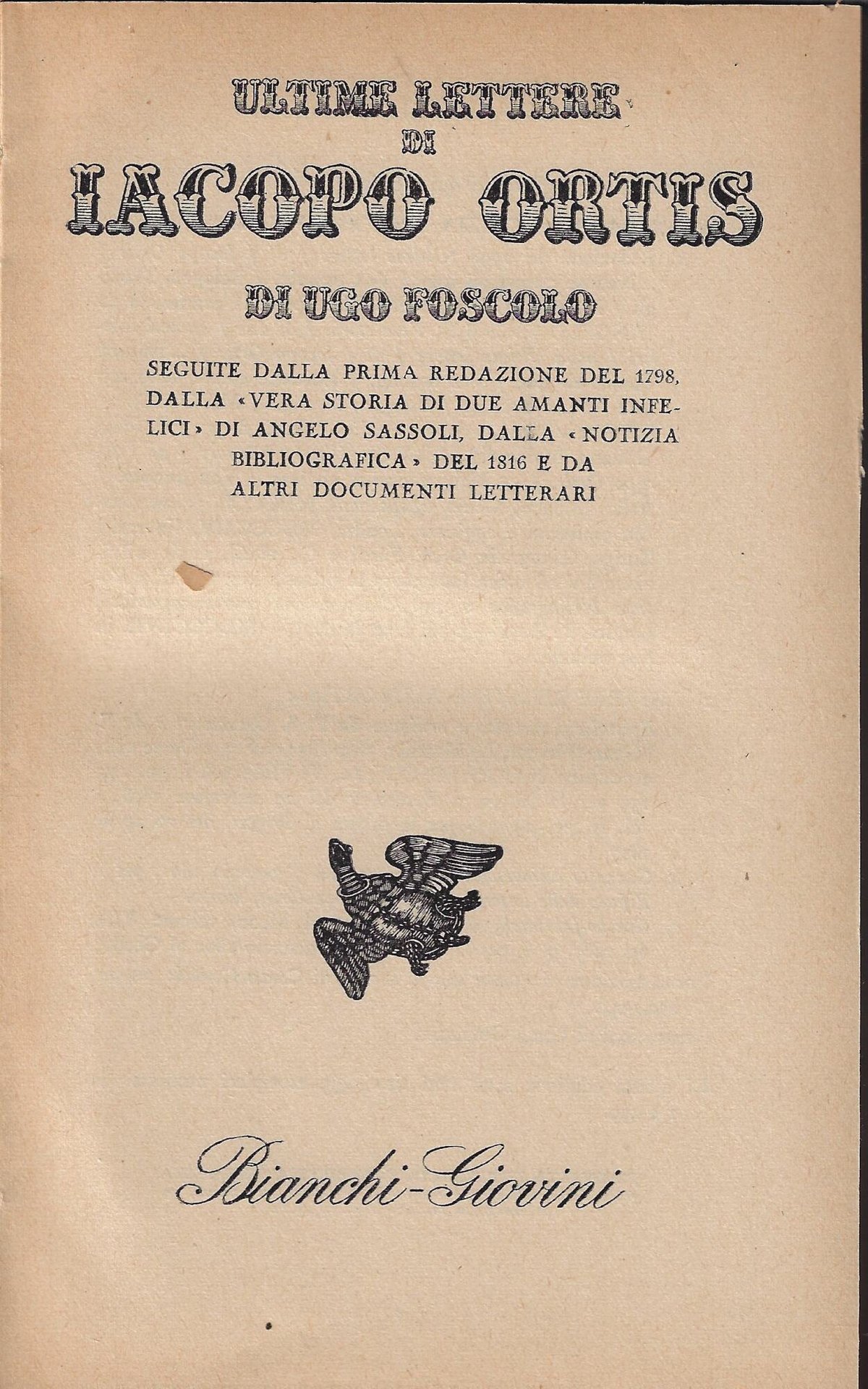 Ultime lettere di Iacopo Ortis : seguite dalla prima redazione del 1798 / di Ugo Foscolo . [Seguite] dalla Vera storia di due amanti infelici