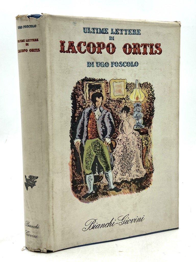 Tela editoriale con sovraccoperta illustrata, cm 22 x 14.5, pp XXII 373 (3), numerose illustrazioni in nero, antiporta a colori che riprende il piatto della sovraccoperta. Collana Aretusa, Narrativa Classica Italiana e Straniera. Sul margine della sovraccoperta strappetti e sul piatto posteriore mancanze, peraltro ben conservato con qualche arrossamento. Edizione dell'Ortis curata da Carlo Cordié nella raffinata collana Aretusa di Bianca Ugo e Ugo Dettore, con illustrazioni di Loris Gualazzi. Seconda edizione (ottobre 1945, Arti Grafiche Valsecchi) dopo la prima del settembre 1944. Contiene il testo dell'edizione definitiva (Londra 1817), quello della prima parte pubblicata nel 1798, le aggiunte apocrife di Angelo Sassoli (la seconda parte, le Annotazioni e Alcune memorie), oltre ad alcune lettere (a Goethe, a Bartholdy) e dediche. Ugo Dettore (1910-1992), scrittore e traduttore, collaborò con Bompiani presso cui concepì il progetto del grande Dizionario letterario e in quella sede conobbe la moglie Bianca Ugo (1910-1982), traduttrice dal tedesco e l'inglese molto attiva negli anni '30 per Corticelli, Corbaccio, Mondadori, Elettra e lo stesso Bompiani. Sposati nel 1938 Dettore e Ugo fondarono nel 1942 una propria casa editrice intitolandola ad Aurelio Bianchi-Giovini, pubblicista anticlericale dell'Ottocento e nonno di Dettore. La Casa Editrice Bianchi-Giovini fu improntata al recupero di classici e alla traduzione di letterature straniere, patendo non pochi fastidi da parte del regime che spesso non concesse i nulla osta di pubblicazione e addirittura ordinò il sequestro e macero del Satyricon pubblicato nel 1943. La coppia si avvalse peraltro della collaborazione di intellettuali antifascisti quali Ada Prospero Gobetti e Massimo Mila, e nel 1944 fu brevemente incarcerata dai tedeschi a San Vittore. L'ambizioso progetto della Bianchi-Giovini partì con due collane di Saggistica letteraria («Europa») e letteratura («Aretusa»), e con l'Enciclopedia della Donna curata da Bianca Ugo; oltre a Dettore e Ugo, e ai succitati Prospero e Mila, tra i collaboratori della casa editrice ricordiamo Carlo Cordié, Mario Praz, Carlo Bo, Salvatore Fiume. L'ambizioso progetto editoriale, nonostante la pubblicazione nel dopoguerra di molti dei titoli bloccati dal regime, rimase largamente incompiuto e nella collezione Aretusa videro la luce solo 15 delle 150 opere previste. La separazione della coppia e le difficoltà economiche rallentarono molto i lavori; negli anni '50 Ugo Dettore iniziò a collaborare con Garzanti e la casa editrice Bianchi-Giovini, ormai proprietà della sola Bianca Ugo, languì fino a chiudere i battenti nel 1958. La curatissima collezione Aretusa resta una preziosa testimonianza di una delle più interessanti avventure editoriali italiane del '900.