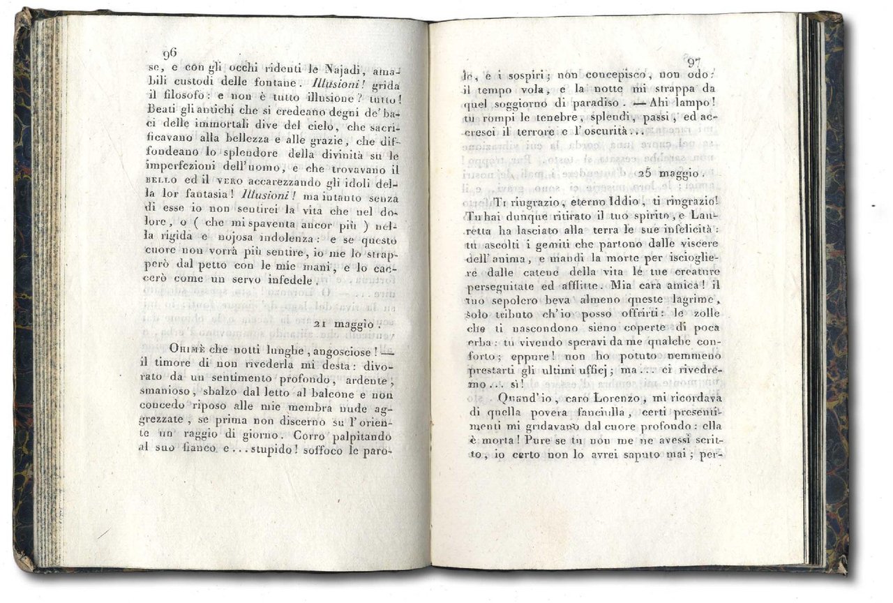 >in-8 (174x118 mm), pp. (10), 244, (4 di “Errori e Correzioni", ultima c. bianca), legatura coeva in m. pelle zigrinata verde, titolo e fregi oro al dorso liscio, piatti in carta marmorizzata. In antiporta vi è il ritratto del Foscolo, inciso in ovale. Edizione cosiddetta Mantovana (così definita dallo stesso Foscolo, che la cita nell'edizione di Zurigo), ovvero la ristampa dell'originale (Milano, Genio Tipografico) pubblicata sempre nel 1802. Fu l'Autore a definire l'edizione 1802 come l'editio princeps, benché fosse stata preceduta da altre tre edizioni che però erano incomplete, stampate senza l'autorizzazione del Foscolo e molto rimaneggiate dall'editore. Questa contraffazione, rara, si evidenzia nel minor numero di pagine e dall'assenza della firma sul ritratto, disegnato da Giuseppe Longhi e inciso da Giovanni Boggi. Non è però da escludere, stando all'Acchiappati e confermato dal Parenti, che Foscolo stesso abbia in qualche modo partecipato alla stampa. Esemplare bello e puro. Ottolini n.79. Acchiappati p.28. Mazzolà, Foscoliana di Treviso, n.13.
