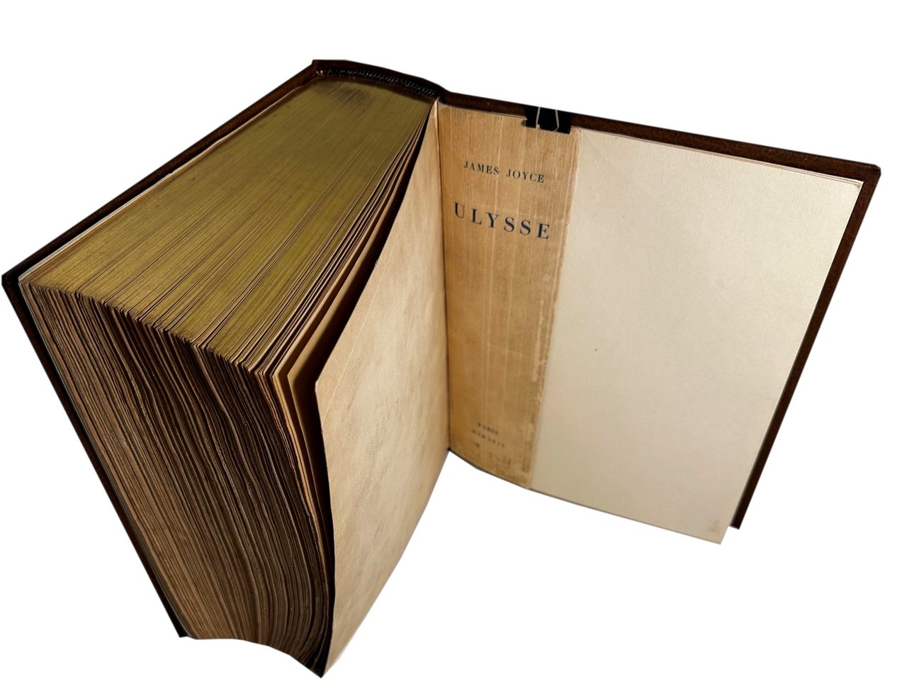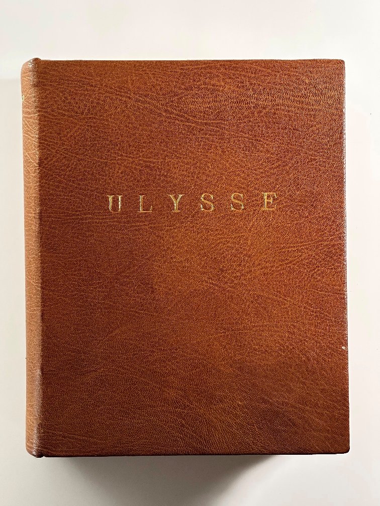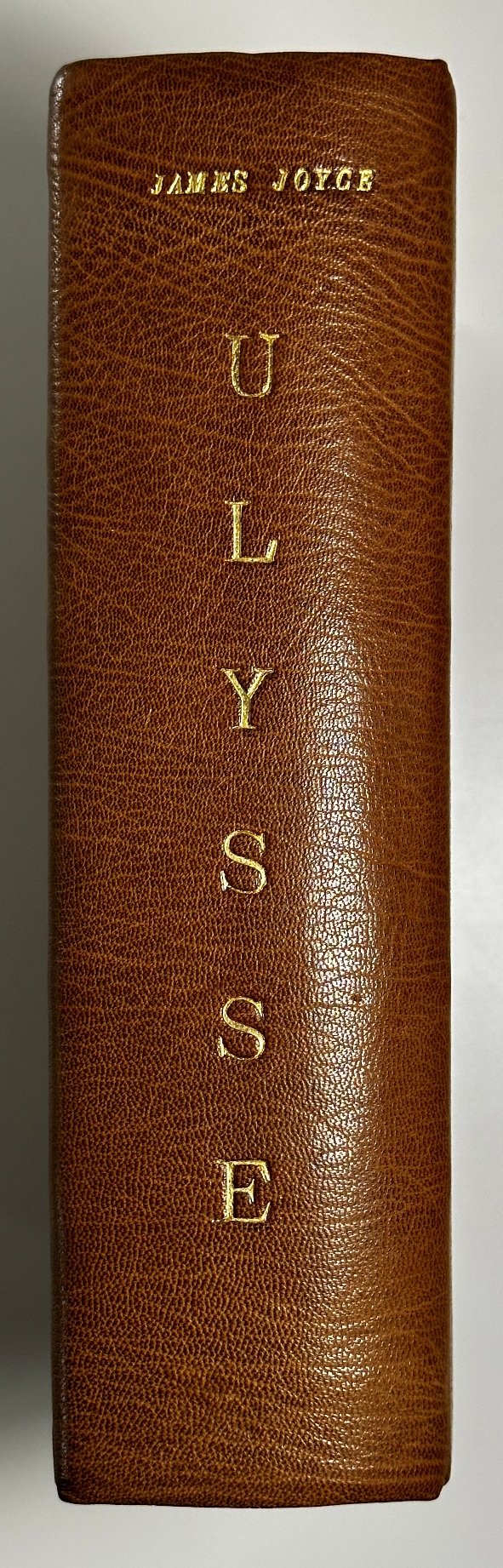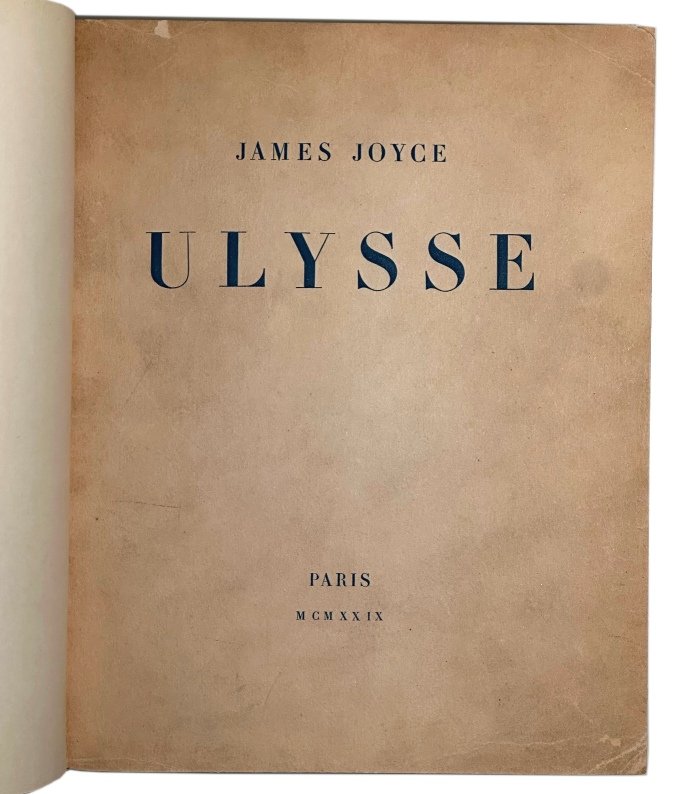 In 8° grande (23,5X18,5) pp. (8) 870 (2) ( fatte salve le bianche e i fogli di guardia della rilegatura recente). Pieno cuoio marocchino havana. Titoli impressi in oro al piatto e al dorso. Taglio alto in oro. Sguardie marmorizzate. Piatti e dorso originali conservati. Piccolo ex-libris. Edizione numerata di 1.200 copie, la nostra è la numero 437 della tiratura delle 875 su carta Alpha vergé. Traduzione di August Morel e Stuart Gilbert con una revisione di Valery Larbaud e dello stesso James Joyce. Copia in ottimo stato di conservazione. Ordinari segni del tempo e una minima mancanza nella parte alta della copertina, restaurata e poco visibile; un piccolissimo segno d'uso al piatto. Interni perfetti