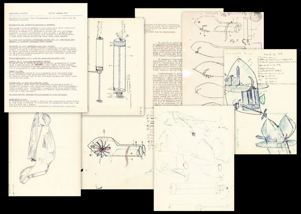 si tratta del progetto per un'invenzione di un apparecchio galleggiante individuale fornito di propulsione e immersione caratterizzato dal fatto che l'immersione può essere volontaria e la propulsione può essere sia muscolare che meccanica; lotto comprendente: 1 descrizione di 3 pp. con 4 copie; 1 descrizione di 6 pp.; 1 lista di apparecchi da costruite sulla base del Salvagente Vidusso (2 pp. più 2 copie); altre 3 pp. di apparecchi da costruire sulla base del salvagente; 1 pag. di note per l'ordine di una particolare maschera alla Pirelli e alla Bergomi; 1 pag. più una copia sull'andamento degli ordini della maschera; 1 lettera di raccomandazione manoscritta di 2 facciare al Colonnello Giulio Cesare Camassia; 3 comunicazione del Ministero delle Corporazioni; 1 comunicazione della Regia Prefettura di Milano; 1 Attestato di Privativa Industriale comprendente 1 descrizione con 1 tav. allegata dell'Ufficio Brevetti, un'altra descrizione ed un invito alla Prefettura di Milano; 1 simpatico disegno a matita Vidusso va al ricevimento; 16 disegni di varie dimensioni a col. e b.n. che illustrano minuziosamente il progetto del salvagente; buoni ess.