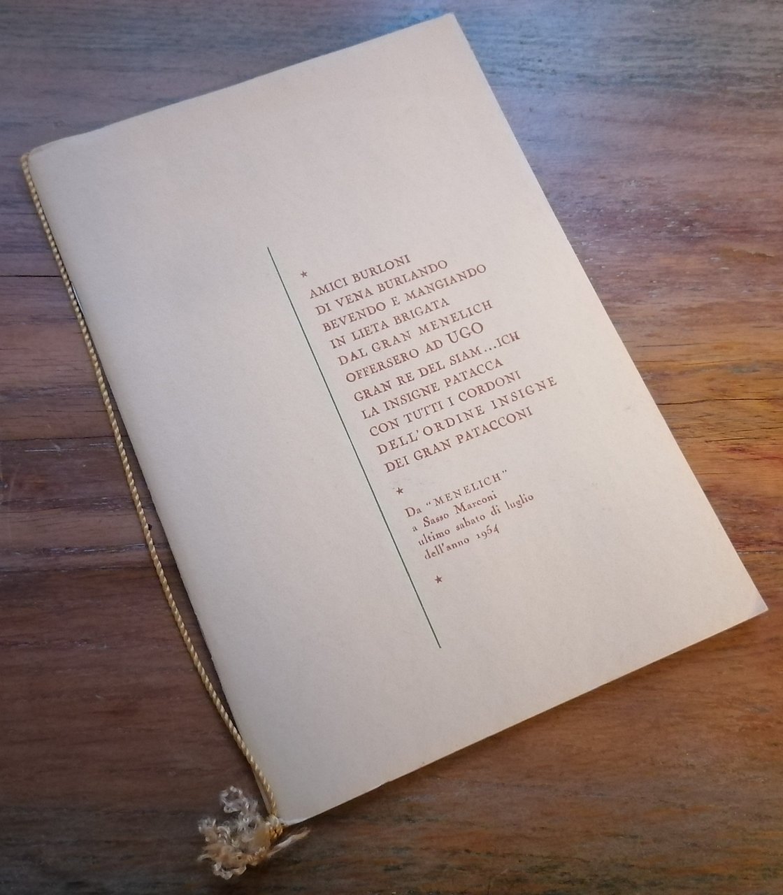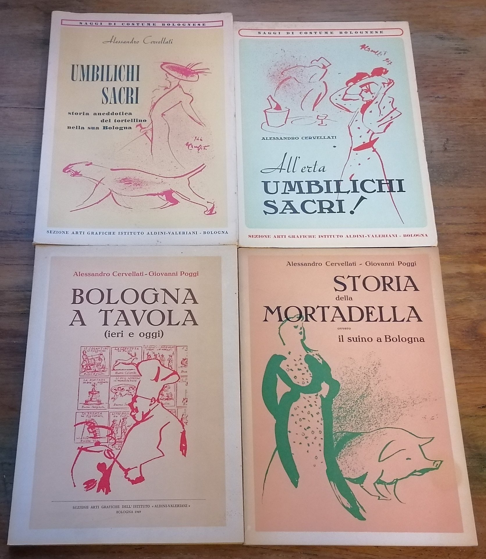 (Bologna - Cucina - Gastronomia - Culinaria) Quattro volumi in 8°, brossure figurate ed illustrazioni all'interno di Alessandro Cervellati. "Umbilichi sacri. Storia aneddotica del tortellino nella sua Bologna", Bologna, Aldini-Valeriani, 1966, pp. 108,(4). "All'erta umbilichi sacri!", Bologna, Aldini-Valeriani, 1967, pp. 78,(2). "Bologna a tavola (ieri e oggi)" con Giovanni Poggi coautore, Bologna, Aldini-Valeriani, 1969, pp. 111,(1). "Storia della mortadella ovvero il suino a Bologna", con Giovanni Poggi coautore, Bologna, Aldini-Valeriani, 1972, pp. 78,(2). Dedica autografa di Giovanni Poggi al primo volume. Alleghiamo libretto di pp. (16), con testo in dialetto bolognese di Mario Bianconi e disegni di Cervellati stampato in occasione di un pranzo in onore di un imprenditore bolognese e donato ai soli partecipanti. Ottimo stato di conservazione.