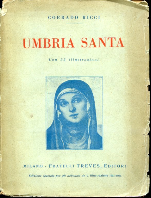 In-8°, pp. 199, (5), brossura editoriale figurata, 55 tavv. in b.n. f.t.Qualche ingiallitura lieve. Buon esemplare. Prima edizione. Indice: Umbria santa, il paesaggio francescano, Visioni francescane in Dante e in Giotto, Santa Rita, il Perugino, il Pintoricchio, Luca Signorelli, Fra voti e capestri, La Madonna del Popolo di Montefalco. La monografia ebbe anche una traduzione in lingua inglese.