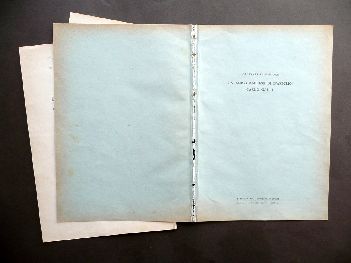 Giulio Cesare Mengozzi, Un amico riminese di D'Azeglio: Carlo Galli - Estratto da Studi Romagnoli", IV (1953) Fratelli Lega, Faenza, s. d. (ma 1953); cm 24x17, da pagina 261 a pagina 266 (esemplare autonomo e completo), con una ill. in b/n nel t. Brossura ed. (esemplare a fogli sciolti, vedi foto). Condizioni di conservazione Esemplare complessivamente in buono stato con tracce d'uso; fogli sciolti e staccati dalla brossura (vedi foto); brossura con leggeri accenni d'ingiallimento ai margini; dorso con alcune piccole mancanze e tracce di precedente inserimento dell'esemplare entro volume (vedi foto). SC03.D12391 N "