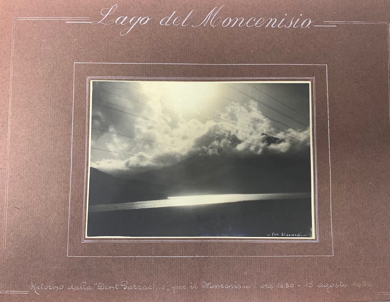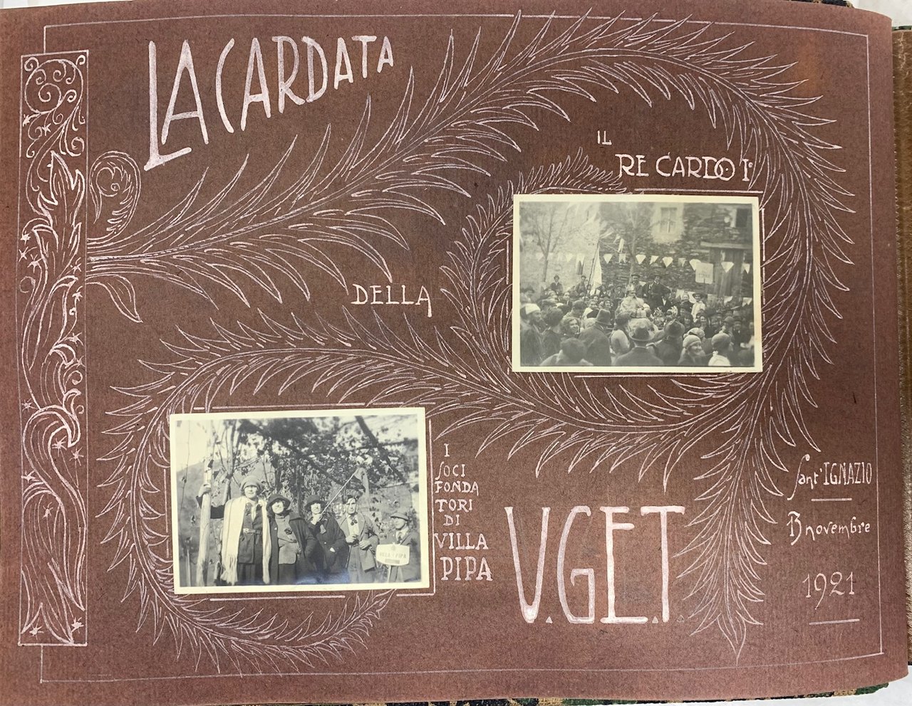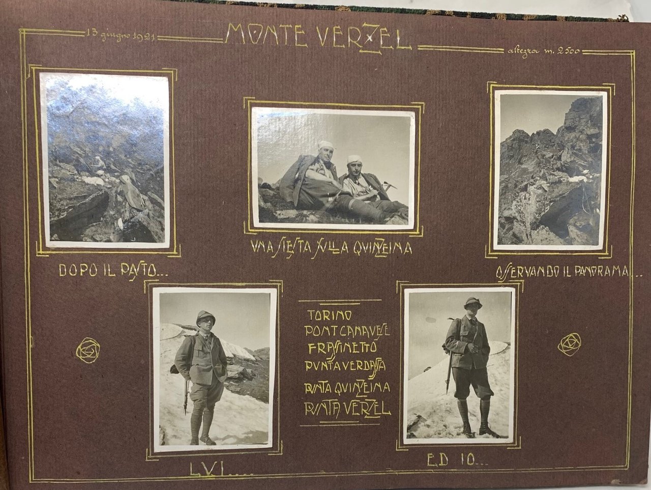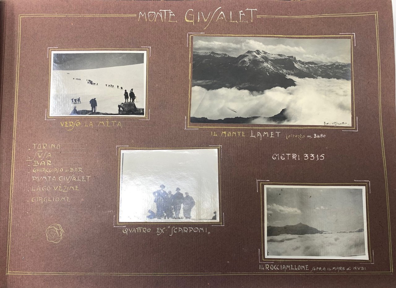 >Album fotografico con 90 fotografie di diversi formati applicate su 23 pagine; legatura coeva in tessuto floreale. Al titolo "Vittorio" ed in basso su tre righe la strofa della poesia di Giovanni Marradi" ... e vi palpita a larghe onde la vita. ... qui dove effondi in rupi di granito. l'eterna poesia ..." Le immagini descrivono le escursioni di un gruppo di esperti alpinisti, tra i quali il "Vittorio" a cui l'album è dedicato. Ogni pagina riguarda una montagna o una localià: Monte Verzel, Givalet, Pian della Mussa, Ciamarella, Bessanese, Ivrea, Le Lunelle, Piano dell'Orso, Val di Susa, Val Pellice, Val Chisone Valle d'Aosta, Monte Colombo, Moncenisio, Vanoise-Savoia etc. Deliziosa testimonianza relativa al periodo, 13 giugno 1921-15 agosto 1922.