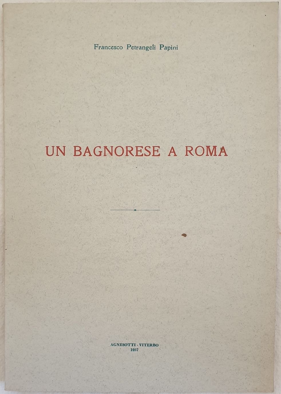 Interessante pubblicazione del 1957 su Bagnoregio di Francesco Petrangeli Papini. L'autore ricerca alcuni elementi del suo paese natio Bagnoregio a Roma: le pietre delle strade, personaggi illustri, Santi ecc. Estratto dal libro inedito "Il ramo sotto gli scrosci Diario strapaesano (Roma 1945-1947)." In ottime condizioni. Copertina editoriale in ottime condizioni generali con lievi usure marginali. Legatura in ottime condizioni. All'interno le pagine si presentano in ottime condizioni. In 8. Dim. 24x17 cm. Pp. 34+(2). interesting pamphlet of 1957 about Bagnoregio by Francesco Petrangeli Papini. The author looks for some elemnts of his town Bagnoregio in Rome: the stones of the streets, important people, Saints ecc. Extract from the inedit book "Il ramo sotto gli scrosci Diario strapaesano (Roma 1945-1947)." In very good conditions Editorial cover in very good general conditions lightly worn in the extremities. Binding in very good conditions. Inside pages are in very good conditions. In 8. Dim. 24x17 cm. Pp. 34+(2).