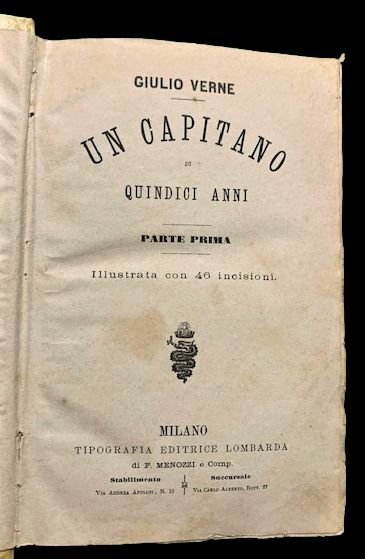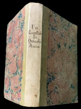 In 8°; due parti in un volume: (4), 205, (3) pp. e (4), 210- 425, (3) pp. Legatura coeva in mezza-pergamena con titolo manoscritto al dorso da mano coeva. Piatti foderati da carta marmorizzata coeva. Seconda, non comune, edizione italiana (una prima uscì sempre per la Tipografia Editricce Lombarda l'anno prima) di questo racconto fantastico di Jules Gabriel Verne, spesso italianizzato in Giulio Verne (Nantes, 8 febbraio 1828 Amiens, 24 marzo 1905), padre, insieme a H. G. Wells, della moderna fantascienza. Illustrazioni realizzate da H. Meyer. Il capitano di 15 anni uscì per la prima volta con il titolo Un capitaine de quinze ans sulla rivista Magasin d'éducation et de récréation nel 1878 e venne poi edito, lo stesso anno, in forma di volume, dalla Hetzel. L'opera fa parte dei lavori maturi di Verne. Ambientato, almeno in parte in Africa, il romanzo suscitò, negli anni seguenti alcune critiche per alcuni passaggi che potevano essere letti come razzisti. In realtà come ben descritto da Cependant, Jean Chesneaux et Olivier Dumas, Ce racisme de Jules Verne, son attitude méprisante, s'applique davantage aux couches dirigeantes et aux aristocraties tribales qu'aux peuples d'Afrique et d'Océanie dans leur ensemble. Ce qu'il dénonce le plus volontiers, comme typique de la « barbarie » africaine, ce sont les hécatombes rituelles à l'occasion des funérailles d'un souverain, tel le roitelet congolais dans Un capitaine de quinze ans (seconde partie, chapitre 12) ou les immolations massives de prisonniers en l'honneur de l'intronisation du nouveau roi du Dahomey auxquelles met fin Robur du haut de son aéronef (p. 142).. Raro.