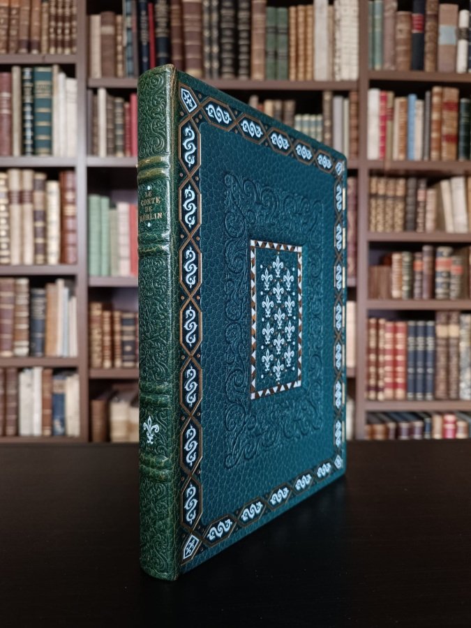 <span style="font-style: normal;">In-8° (cm. 27,8), bellissima e suggestiva legatura editoriale realizzata dal maestro Barthelemy in piena pelle verde ottanio a grana grossa, piatti inquadrati da una prima elegante cornice alla greca in oro ornata con fregi in turchese e una seconda composta da motivi fitomorfi a secco che racchiude a sua volta un quadretto cassettonato seminato di gigli turchesi entro una cornice di motivi geometrici in oro, verde e turchese; dorso a nervi con titolo in oro, un giglio in turchese e ricchi fregi floreali a secco ai comparti; tagli dorati e risguardi in carta decorata con gigli in oro; pp. CI [12] su </span><i>Lana filigrané à l'enseigne Sefer-Pardo</i>, in ottimo stato; con 1 doppia tavola a colori. Testo gotico interamente inquadrato da graziose cornici figurate e con disegni ispirati alle miniature medievali, il tutto stampato a vividi colori. Le illustrazioni sono disegnate e colorate all'acquarello dall'illustratore e miniatore Lucy Boucher. Edizione originale di 2460 esemplari, il nostro è il n. 2046; con il certificato di garanzia emesso dall'editore. In ottimo stato, conservato in custodia editoriale in tela blu con interno felpato. (NX)