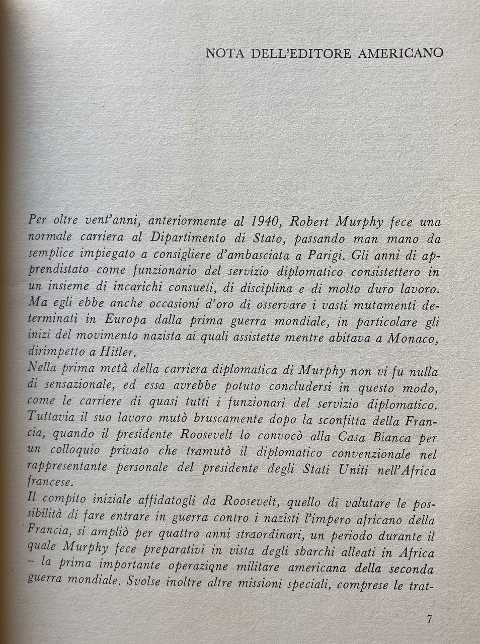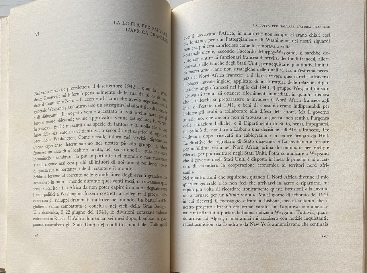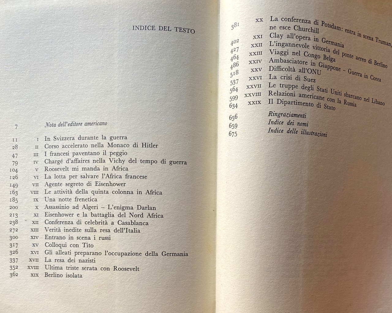 Soggetti: Biografie Memorie Diplomazia americana Storia contemporanea Diplomatici americani Politica internazionale Governo Relazioni internazionali Operazione Torch Consoli Affari esteri Vichy Inviato speciali Roosevelt Nord Africa francese Negoziati Accordi economici Trattative Trattati Missioni Maxime Weygand Clark Guerre Comando supremo Armistizio italiano Consiglieri statunitense Alleati Italia Germania Ambasciatori Belgio Giappone Segretario di stato Dwight Eisenhower Asse Potenze Seconda guerra mondiale Marocco Algeria Stalin Afrika Korps Rommel El Alamein Sbarco in Normandia Raymond Cartier Ministero Libri illustrati Autobiografia Scritti Anni Trenta Anni Quaranta Anni Cinquanta Anni Sessanta Guerra fredda Nazismo Comunismo Russia Unione Sovietica Francia Inghilterra Mussolini Fascismo Svizzera Monaco di Baviera Hitler Tito Balcani Occupazione tedesca Germani Europa Resa Nazisti Truman Churchill Esercito Agente segreto Quinta Colonna Darlan Casablanca Ponte aereo Berlino Congo Belga Corea Nazioni Unite Crisi di Suez Truppe americane Libano Amministrazione Ammiraglio Consiglio Quartier generale Forze alleate Gran Bretagna William Bullitt Byrnes Campagna Carriera Lucius Clay Comandante Conferenza Cooperazione Dakar Delegazione Dipartimento Dulles Ambasciata Combattimenti Servizio De Gaulle Giraud Leahy Lemaigre-Dubreuil Londra Macmillan Maresciallo Pétain Marshall Questione Incontri Mediterraneo Militare Mosca Nasser Marina navale Noguès Ufficiali Operazioni Parigi Piani politici Dopoguerra Potsdam Primo Ministro Rapporti Problemi Roma Soldati SHAEF Personale Discorso Vishinsky Washington Weygand Zona Saggi Collezionismo Libri fuori catalogo Kennedy Johnson Nixon Corning Glass International Onorificenze Croix de Guerre Sol Levante Staff Medaglie Decorazioni Indipendenza Harold MacMillan Kirk Teheran Iran Montgomery MacFarlane Yalta Connolly Anversa Dean Acheson Westmoreland Selwyn Lloyd Syngman Rhee United Press Pineau Egitto Cipro Douglas Dillon Christian Herter Pietro Badoglio Re Baldovino Léon Blum Bogomolov Pierre Boisson Bohlen James Byrnes Fuad Chehab Cairo Camille Chamoun Casa Bianca Cina Mao-Tse Tung Liberazione Cuba Fidel Castro Donovan Anthony Eden Francisco Franco Fenard Faruk Cordell Hull Hirohito Himmler Hiroshima Nagasaki Hussein Lehay Israele Sionismo Ebrei MacArthur Lenin Marx Nasser Molotov New Deal Ribbentrop Pearl Harbor Paul Reynaud ONU SHAEF Sicilia Ideologie politiche Togliatti Vysinskij Zukov Wilson Marines Viaggio Testimonianze Biographies Memoirs American Diplomacy Contemporary History American Diplomats International Politics Government International Relations Operation Consuls Foreign Affairs French Special Envoy Negotiations Economic Agreements Negotiations Treaties Missions Wars Supreme Command Italian Armistice US Advisors Allies Italy Germany Ambassadors Belgium Japan Secretary State Dwight Eisenhower Axis Powers Second World War Morocco Normandy Landings Ministry Illustrated Books Autobiography Writings 1930s 1940s 1950s 1960s Cold War Nazism Communism Soviet Union France England Fascism Switzerland Munich Balkans German Occupation Germany Europe Surrender Nazis Army Secret Agent Fifth Column Airlift Belgian Korea United Nations Crisis Troops Lebanon Administration Admiral Council Headquarters Allied Forces Great Britain Campaign Career Commander Conference Cooperation Delegation Department Embassy Combat Service London Marshal Issue Meetings Mediterranean Moscow Officers Operations Paris Political Plans Post-war Prime Minister Relations Problems Rome Soldiers Speech Area Essays Collectibles Out of print books Honors Land Rising Sun Medals Decorations Independence King Baldwin White House China Liberation Zionism Jews Sicily Political ideologies Travel Voyage Testimonials