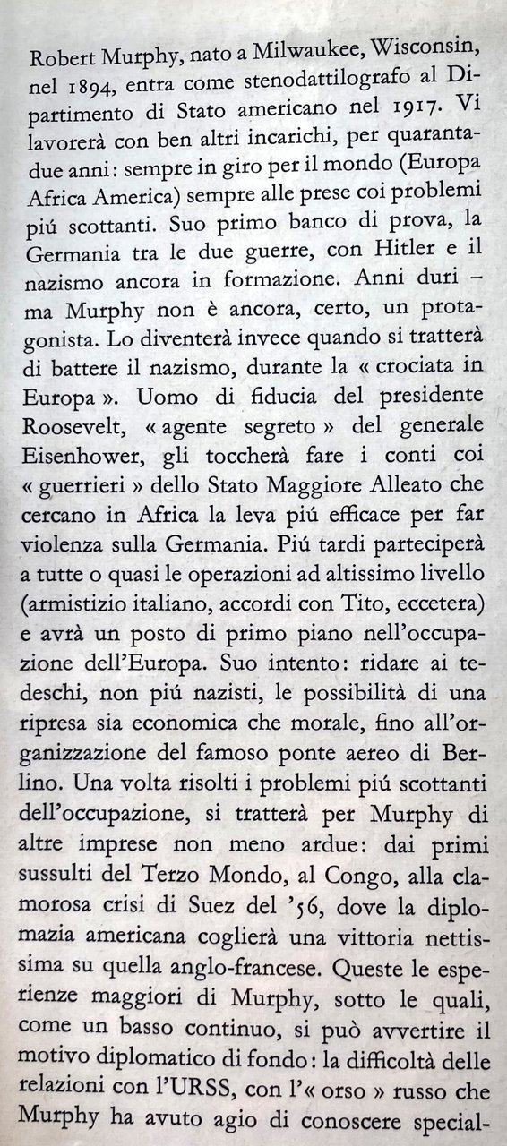 Robert Murphy, nato a Milwaukee, Wisconsin, nel 1894, entra come stenodattilografo al Dipartimento di Stato americano nel 1917. Vi lavorerà con ben altri incarichi, per quarantadue anni: sempre in giro per il mondo sempre alle prese coi problemi più scottanti. Suo primo banco di prova, la Germania tra le due guerre, con Hitler e il nazismo ancora in formazione. Anni duri ma Murphy non è ancora, certo, un protagonista. Lo diventerà invece quando si tratterà di battere il nazismo, durante la crociata in Europa. Uomo di fiducia del presidente Roosevelt, agente segreto del generale Eisenhower, gli toccherà fare i conti coi guerrieri dello Stato Maggiore Alleato che cercano in Africa la leva più efficace per far violenza sulla Germania. Più tardi parteciperà a tutte o quasi le operazioni ad altissimo livello (armistizio italiano, accordi con Tito) e avrà un posto di primo piano nell'occupazione dell'Europa. Suo intento: ridare ai tedeschi, non più nazisti, le possibilità di una ripresa sia economica che morale, fino all'organizzazione del famoso ponte aereo di Berlino. Una volta risolti i problemi più scottanti dell'occupazione, si tratterà per Murphy di altre imprese non meno ardue: dai primi sussulti del Terzo Mondo, al Congo, alla clamorosa crisi di Suez del '56, dove la diplomazia americana coglierà una vittoria nettissima su quella anglo-francese. Queste le esperienze maggiori di Murphy, sotto le quali, come un basso continuo, si può avvertire il motivo diplomatico di fondo: la difficoltà delle relazioni con l'URSS, con l'orso russo che Murphy ha avuto agio di conoscere specialmente durante la drammatica conferenza di Potsdam, nel '45. Ma, come scrive Murphy in chiusura, il passato non è che un prologo. E il futuro? Quale sarà la funzione della diplomazia americana negli anni della luna? Un diplomatico non è un astrologo, s'intende. E tuttavia ci può fornire elementi che contengano dei semi di futuro. Proprio perché è in grado di sorprendere la storia nel suo farsi. Proprio perché ci dà continue testimonianze (e ipotesi) sui rapporti tra la natura dell'uomo politico e l'impresa cui egli si vota. E queste testimonianze, in Murphy, sotto l'apparente semplicità di un'autobiografia, sono di primordine. Soprattutto, crediamo, per una ragione. La diplomazia americana, come arte di lungo corso, si può dire si sia sviluppata in questi ultimi cinquant'anni. E sviluppandosi, sempre in attrito con quella europea di antichissima tradizione, ha esaltato alcune sue caratteristiche ingenue. Ora è appunto in tale tipo di ingenuità che si può individuare una linea continua. Che consiste poi nel rifiuto di restringere l'azione diplomatica al solo gioco, machiavellico, tra golpe e lione; nello sforzo di inventare nuovi modi politici dell'essere e dell'agire. Frutto, s'intende, di un'impostazione ideologica e pratica assai diversa da quella del vecchio mondo, ma non meno valida. Le prove in questa autobiografia nelle righe e tra le righe: basta saperle cogliere; tenendo presente, inoltre, che dal New Deal di Roosevelt alla Nuova Frontiera di Kennedy non c'è il deserto ma qualcosa di più: una vocazione, pur con clamorosi ritorni di fiamma, alla conoscenza intercontinentale. L'America che monta a cavallo della tigre.