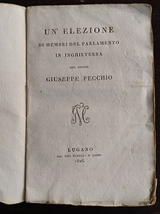 <span style="font-style: normal;">In-8° (cm. 16,8), brossura coeva con titolo manoscritto al dorso (minime tracce d'uso, antica etichetta di collocazione al piede); pp. 120 in barbe, in stato molto buono (lievi fioriture sparse, </span><i>Ex Libris</i> impresso al risguardo). Prima edizione di questo saggio dell'economista milanese in esilio a Londra, in cui descrive la complicata e laboriosa procedura politico-sociale che condusse alla nomina dei membri del nuovo parlamento avvenuta in Nottingham nella sala della borsa valori. Esemplare molto buono. (NJ1)