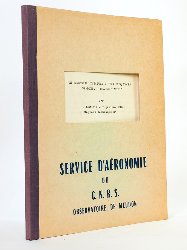 1 vol. in-4 br. polycopié, Service d'aéronomie du C.N.R.S, Observatoire de Meudon, 1963, 31 pp. + 10 pp. d'annexe + 18 pl. Très bon état. L'auteur devait passer sa thèse de docteur en astronomie quelques années plus tard (1966), toujours à Meudon, sous la direction de Jean-Louis Steinberg. Puis, il continua de travailler pendant quelques années dans l'équipe de ce dernier, avant de s'installer à l'observatoire de Bordeaux. Cette équipe réalisa en particulier des expériences sur les fusées Rubis 02 (1965) et Rubis 04 (1967) lancées par le CNES depuis la base saharienne de Hammaguir. Ces fusées atteignaient l'altitude de 1600 km, c'est-à-dire assez haut pour pouvoir mesurer le rayonnement galactique sur quelques Mhz, sans être perturbé par l'ionosphère (qui se comporte comme un miroir envers ce rayonnement). Le présent document semble bien avoir été écrit en amont de ce programme. En effet, il présente un émetteur qui faisait partie d'un ensemble "destiné à mesurer la densité électronique dans la couche E de l'ionosphère par la méthode SEDDON" (du nom de J.C. Seddon, scientifique du Rocket Sonde Branch du NRL américain).