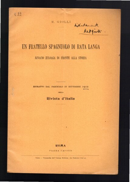 Opuscolo vintage. Estratto dal fascicolo di settembre 1912 della Rivista d'Italia. Dedica autografa dell'autore. Segni di matita in copertina. Piega centrale. Ordinario segno del tempo.