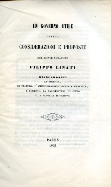 Un governo utile ovvero considerazioni e proposte risguardanti la politica, lo statuto, l'amministrazione locale e generale, l'esercito, la magistratura, il clero e la pubblica istruzione