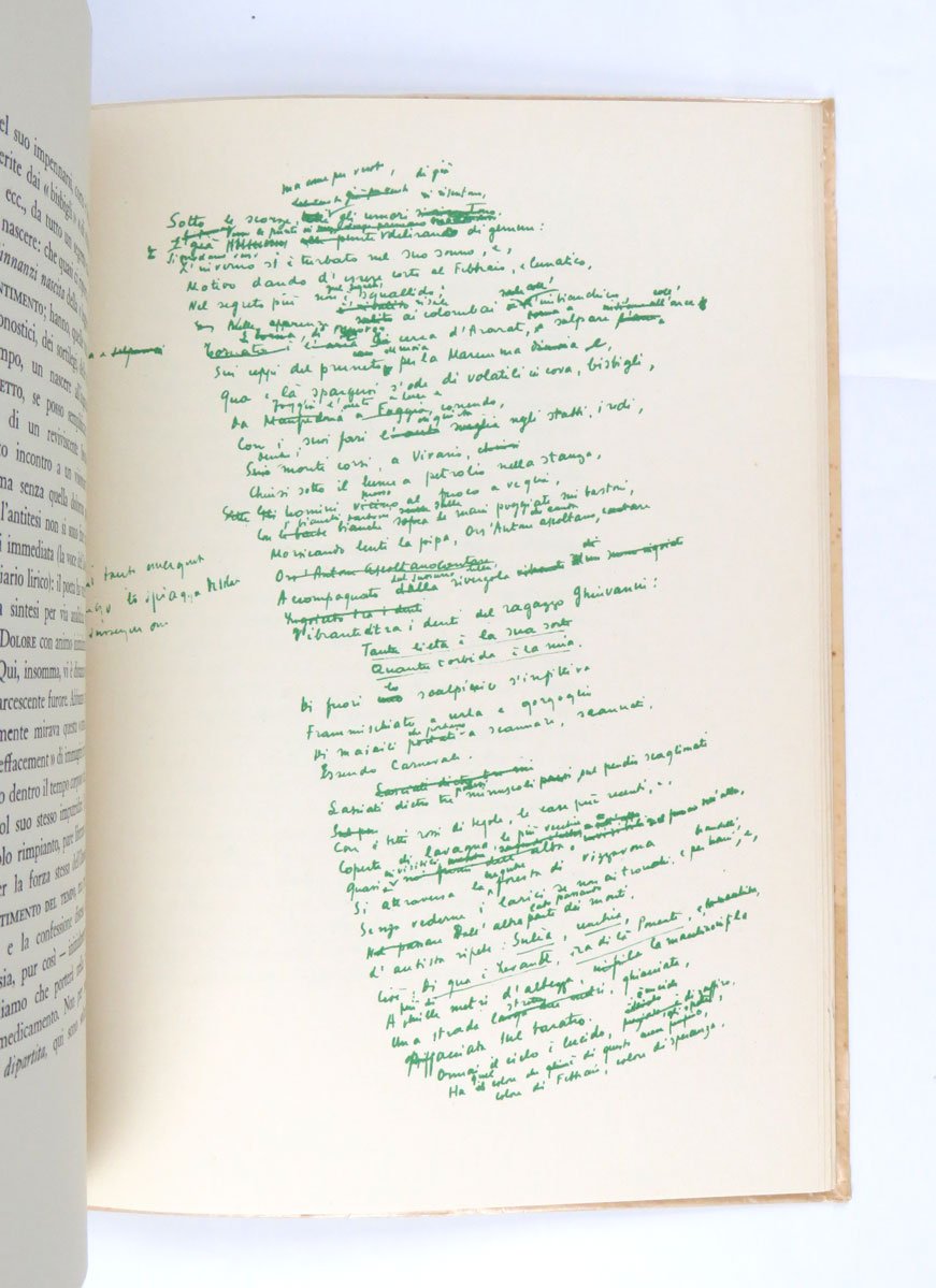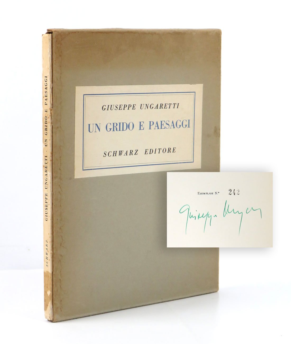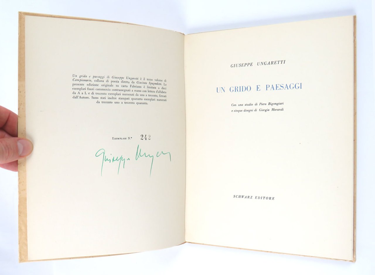 LIBROEdizione originale.CON AUTOGRAFO.Esemplare 242 di 340 numerati, in più che buone condizioni, quasi ottime, completo dell’asstuccio editoriale a stampa e del previsto pergamino editoriale a proteggere la copertina (gora al margine del cofanetto, lievemente brunito; fioriture ai piatti, evidenti al piatto anteriore; normali lacerazioni al pergamino, in particolare al dorso; per il resto fresco e pulito); ben completo della firma autografa del poeta al colophon, vergata nel tradizionale inchiostro verde.Raccolta di poesie stampata in pregevole confezione editoriale per le cure di Giacinto Spagnoletti e Arturo Schwarz, in un formato e con un pregio del tutto inusuale per la collana, evidentemente come strenna di fine 1952. La tiratura è limitata a 350 copie di cui dieci A-L e le restanti 1-340 (con un dettaglio curioso: «La presente edizione originale su carta Fabriano è limitata a [.] trecento esemplari numerati da uno a trecento, firmati dall’autore. Sono stati inoltre stampati quaranta esemplari numerati da trecento uno a trecento quaranta»). -- Pubblica per la prima volta in libro: il «Monologhetto», scritto per il Terzo programma della radio RAI a fine 1951 e apparso in pre-originale sulle colonne di «Paragone» n. 26 e «Approdo» n. 1; «Gridasti: soffoco.», una variante dell’incipit di «Giorno per giorno» del «Dolore», ripreso da pubblicazioni periodiche; una suite di prose e poesie, «Svaghi», composti per il numero unico del premio Viareggio nel 1952, quindi sul n. 3 di «Approdi»; «Semantica», un divertissement brasiliano apparso sul n. II/2 della rivista Pirelli, quindi su «Alfabeto» nel 1952 (le note in fine di libro sono comunque molto precise). -- Cinque raffinate riproduzioni da matite di Giorgio Morandi ornano le pagine; in fine, il corposo saggio «Sugli autografi del “Monologhetto”» di Bigongiari, con la riproduzioni a colori di una pagina del manoscritto.