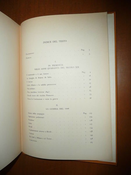 DESCRIZIONE: Ed. Stato Maggiore dell'Esercito Ufficio Storico, Roma, 1977, in 8°, leg. ed. tela marrone, pp. 284 con 13 ill. b/n f.t. L'Ufficio Storico dello Stato Maggiore dell'Esercito è lieto di pubblicare ora, tradotte dall'originale francese ed annotate con puntualità e competenza dal Generale Luigi Mondini, le memorie di un aristocratico savoiardo, ufficiale dell'Esercito piemontese. Intrepido combattente della I^ guerra d'indipendenza, e purtuttavia ancorato a vecchie e superate tradizioni, refrattario alla comprensione della grandezza di quegli avvenimenti, Eugenio De Roussy De Sales ci offre un'immagine del Risorgimento molto lontana da quella oleografica tradizionale, insolita come ha voluto definirla il curatore del volume. Indice completo in foto. CONDIZIONI: Ottime. Un piccolo strappo nella parte bassa del dorso. PESO / WEIGHT: 750 gr. without package