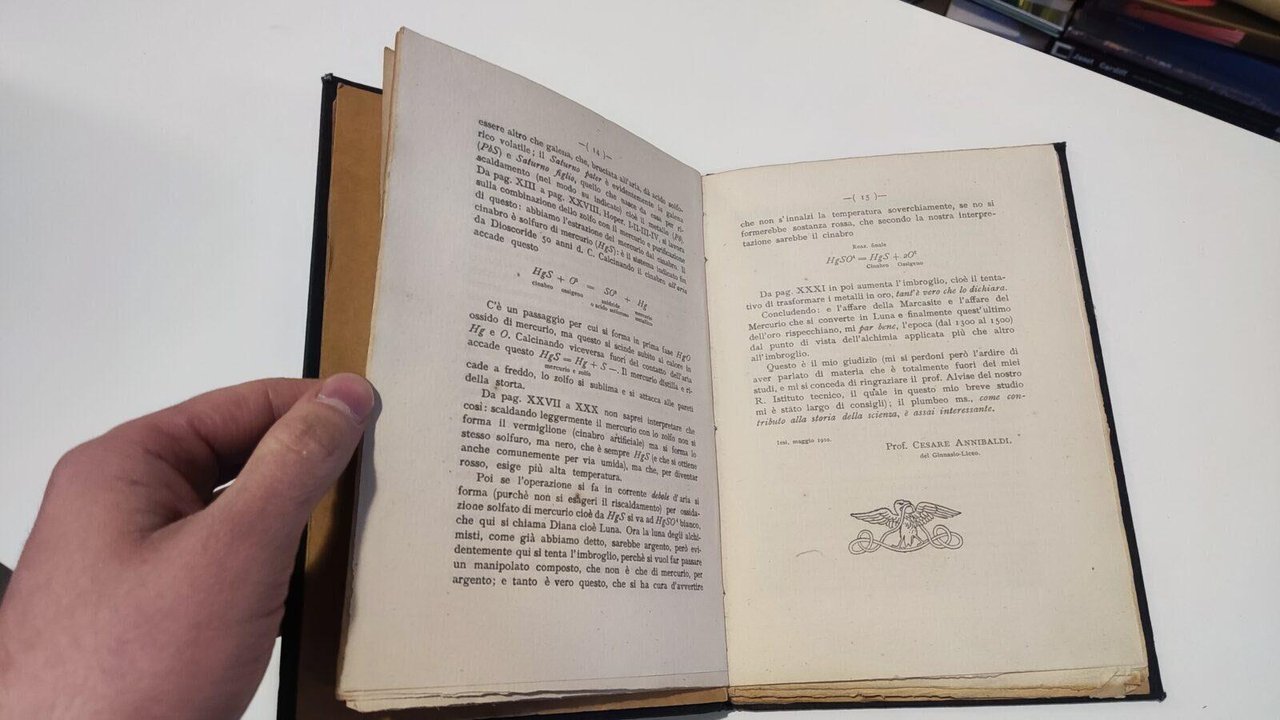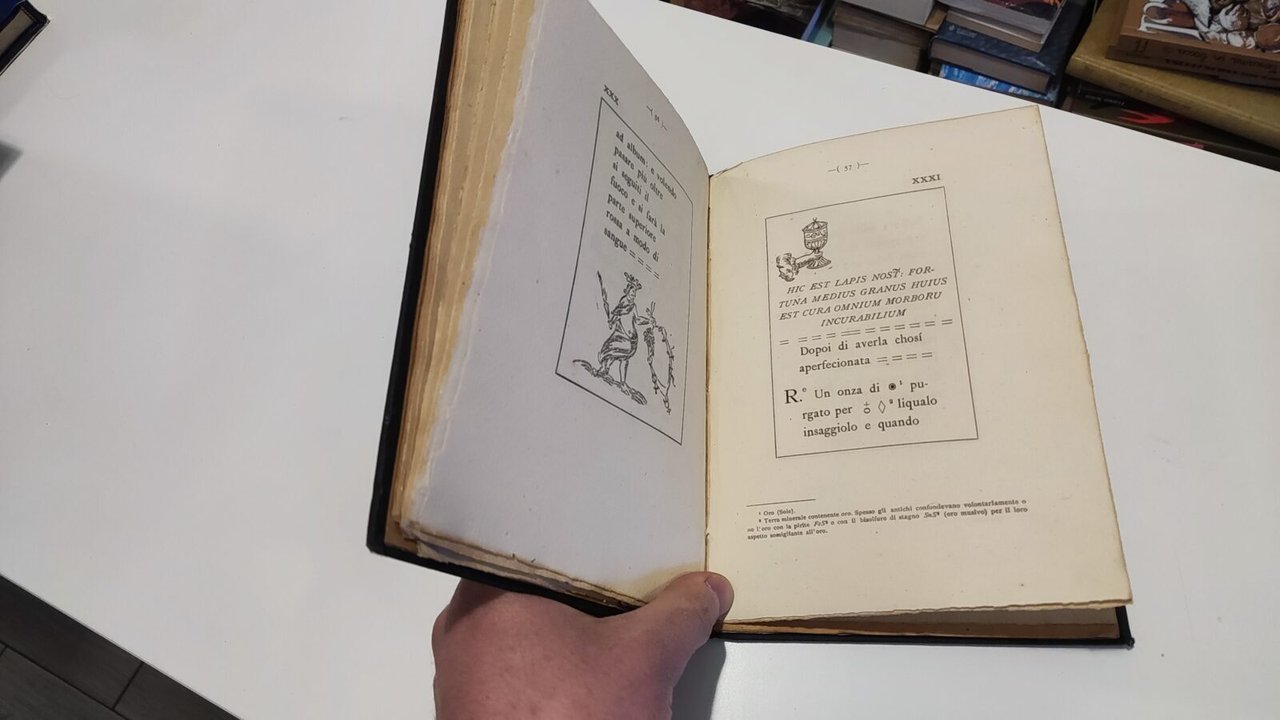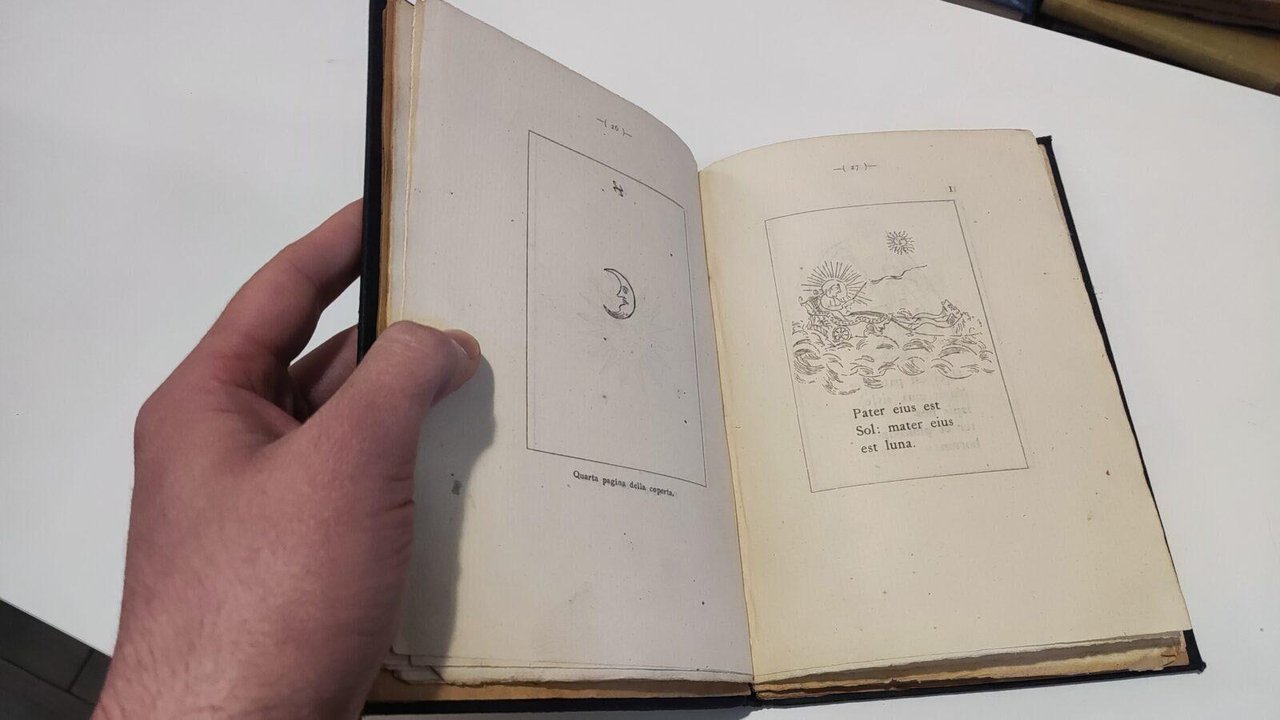 Un libretto di alchimia inciso su lamine di piombo nel secolo XIV conservato nella biblioteca del fu prof. comm. Scipione Lapi Pubblicato con introduzione, note e 13 facsimili da Angelo Marinelli, con prefazione del Prof. Cesare Annibaldi Città di Castello - Tipografia dello stabilimento S. Lapi 1910 Preziosa e introvabile opera massonica sull'alchimia successivamente riprodotta da Edizioni Meditrerranee. Il Libretto d'alchimia è un codice plumbeo d'incerta datazione che, trovato nella biblioteca di Scipione Lapi, fu stampato, quasi alla macchia, nel 1910. Una certa notorietà gli venne dal comportamento che Arturo Reghini (Pietro Negri) gli dedicò uno dei fascicoli di UR. Di fatto, però, il "Libretto", con le sue incisioni naif, è rimasto un oggetto nascosto, perché le immagini dell'originale non furono riprodotte da Reghini, e perché, in pratica, il libro diventò introvabile. Dal libretto d'alchimia emerge l'incisione della III tavola che rappresenta, con voluta sciatteria, la splendida metafora dell'androgine. Libro in ottime condizioni, rilegato con una copertina rigida in tela nera. Le pagine non presentano difetti di rilievo salvo la mancanza dell'angolo inferiore di pagina 17, alcuni margini possono essere leggermente ingialliti. Non esitate a contattarci per altre foto o richieste. Saremo lieti di soddisfare ogni vostra esigenza.