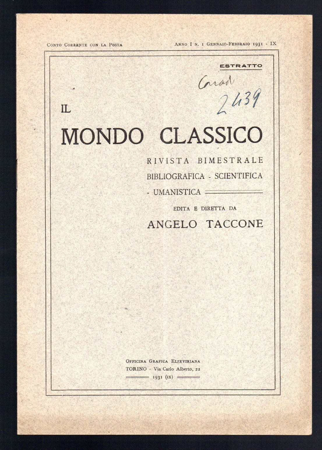 Opuscolo vintage. Estratto da "Il mondo classico" - Anno. I - N. 1 - gennaio-febbraio 1931. Ordinario segno del tempo.