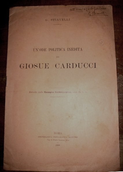 Fascicolo in 8, brossura editoriale, titolo al piatto, con a margine la dedica autografa dell'autore all'amico Carlo Giordano, frontespizio, 13 pp., bianche finali. Rara edizione di un Ode politica inedita di Giosu Carducci, pubblicata col gentile permesso della famiglia di lui, dal titolo 'Grido di Guerra', seguita dalla descrizione e dal commento di Stiavelli che ne spiega la provenienza e l'origine ispirata da un disegno di Gherardi in memoria di Cesare Taruffi, giovane caduto nella battaglia di Curtatone. Pubblicazione assai poco comune, impreziosita dall'autografo di Giacinto Stiavelli, lodato autore di tanti studi preziosi sul nostro Risorgimento politico.