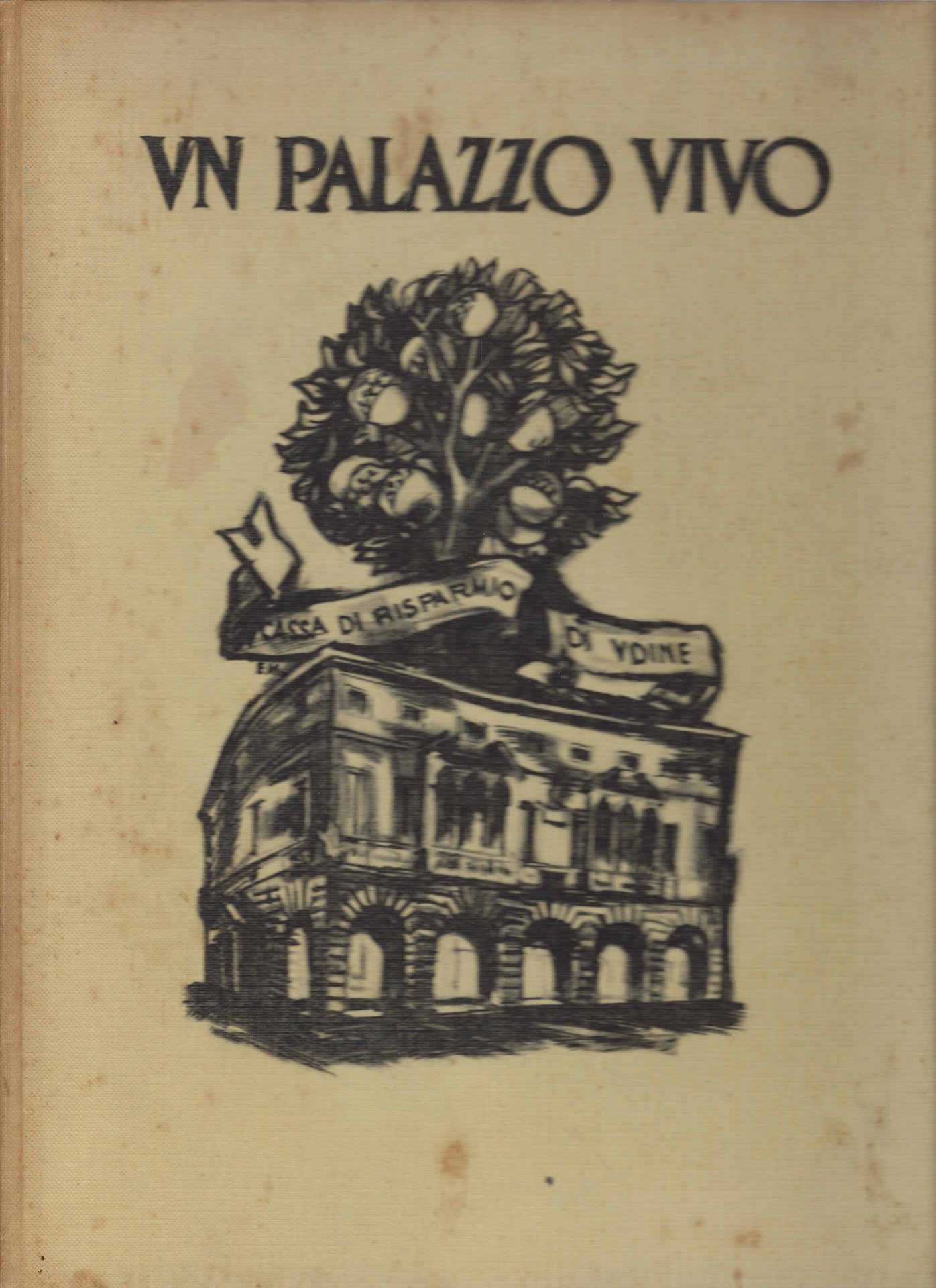 Legatura editoriale in tutta tela crema con titoli e illustrazione della Cassa di Risparmio di Udine al piatto anteriore.
