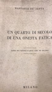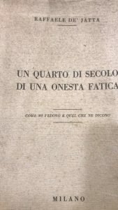 [vt] Pensieri, lettere, attestati ecc. del poliziotto privato, detective, De'Jatta. Contiene pagina di Recensione de Il Popolo d'Italia stampata in blu. Normale brunitura della carta, traccia di adesivo al piatto post. ma buon esemplare. Pagg. 315. Brossura edit. Mis mm 245x170