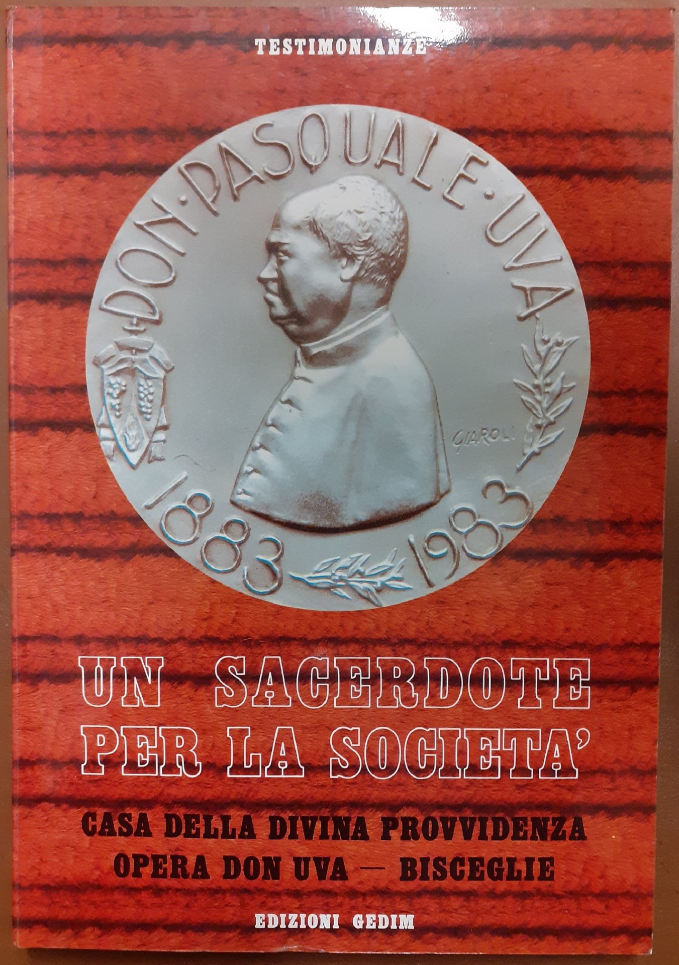 Un sacerdote per la società. Casa della Divina Provvidenza Opera Don Uva – Bisceglie, s.n. (ma Edizioni Gedim, Gruppo Editoriale Meridionale), Bari 1985, pp. VIII, 279, ill. col., cm 31, br. ed. Collana Testimonianze. Volume realizzato dal Gedim s.n.c. (Gruppo Editoriale Meridionale) per conto degli Istituti Ospedalieri Casa della Divina Provvidenza – Opera Don Uva di Bisceglie. Testi ordinati da mons. Felice Posa e da Nicola Bellomo. Edizione fuori commercio. All’interno, cartoncino di invio omaggio e lettera dattiloscritta di presentazione del volume a firma di Nicola Bellomo. Ottimo.