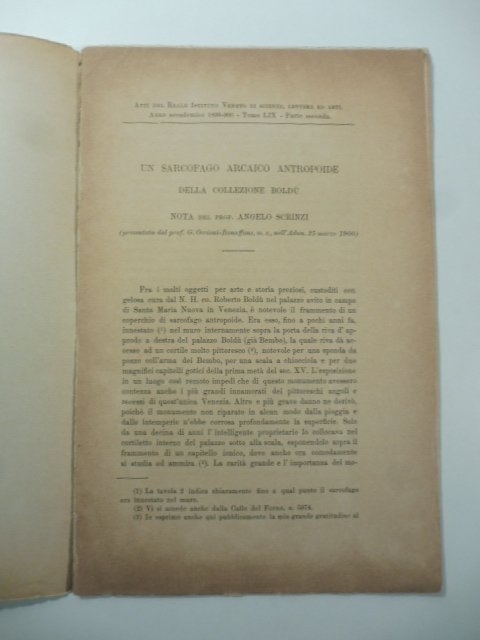 In 8, cm 16 x 25, pp. 14 con 2 tavole fotografiche fuori testo. Brossura editorale. Estratto da Atti del R. Ist. Veneto di scienze, lettere. T. LIX. Descrizione di questo coperchio di sarcofago egizio conservato presso il Palazzo Boldu' (gia' Bembo) in S. Maria Nuova di Venezia