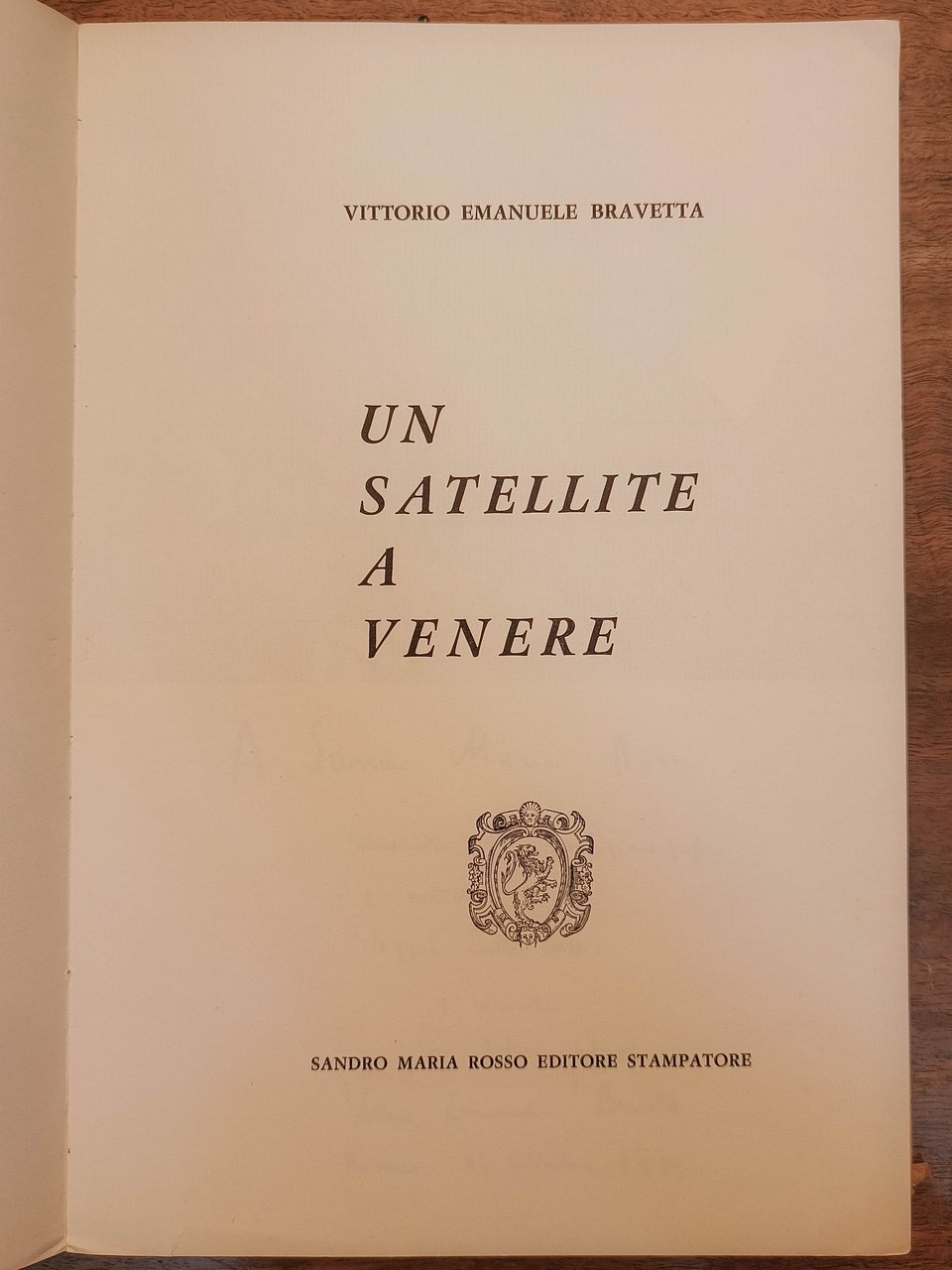 Un satellite a Venere, Biella, Sandro Maria Rosso, 1966. Cm 30. Pp. 100 numerate solo al recto. Brossura editoriale illustrata. Edizione numerata di mille esemplari, copia n. 154. Dedica autografa dell'autore "a Maria Luisa in ricordo del mio adorato compagno. Roma 1941".
