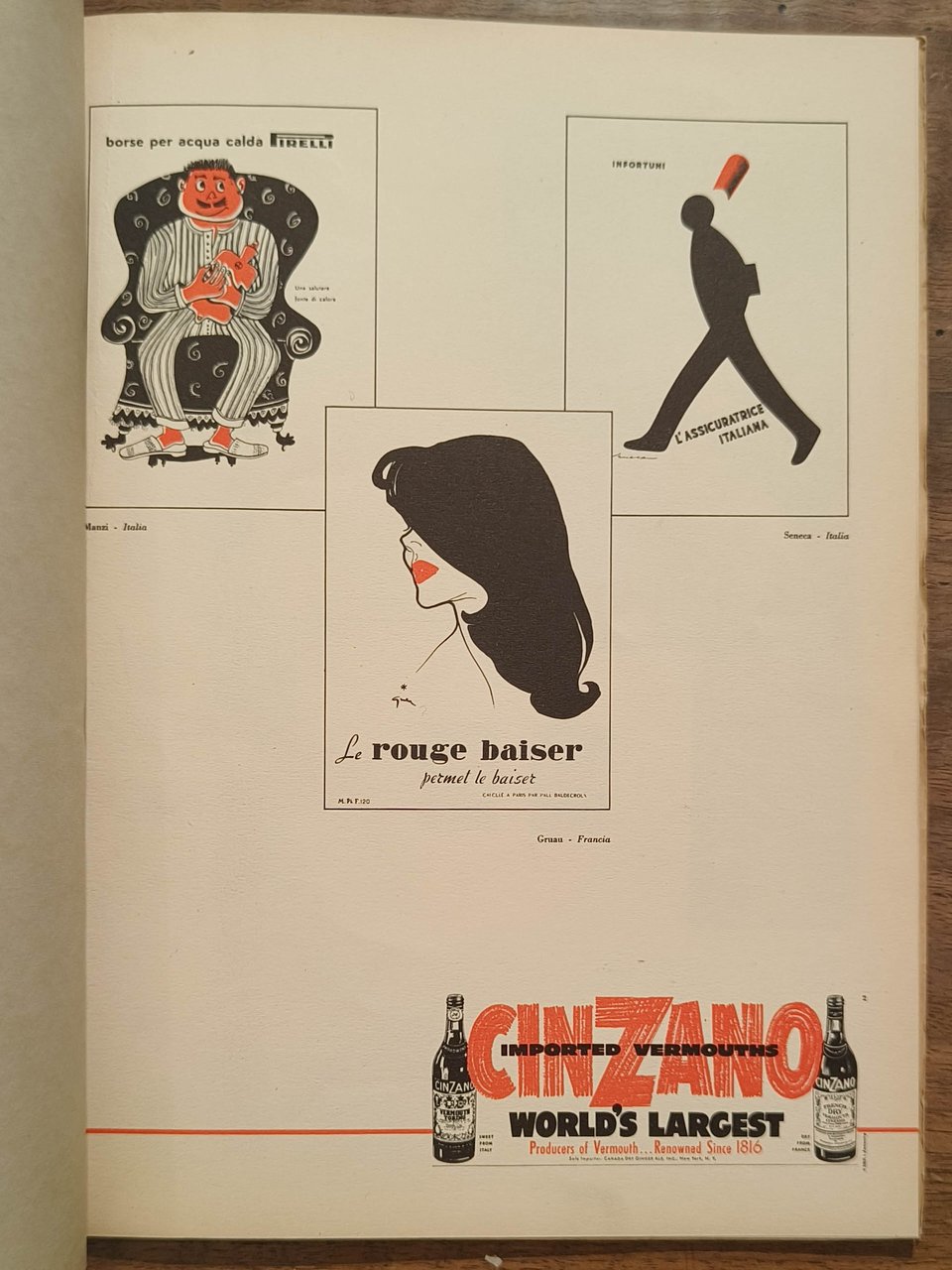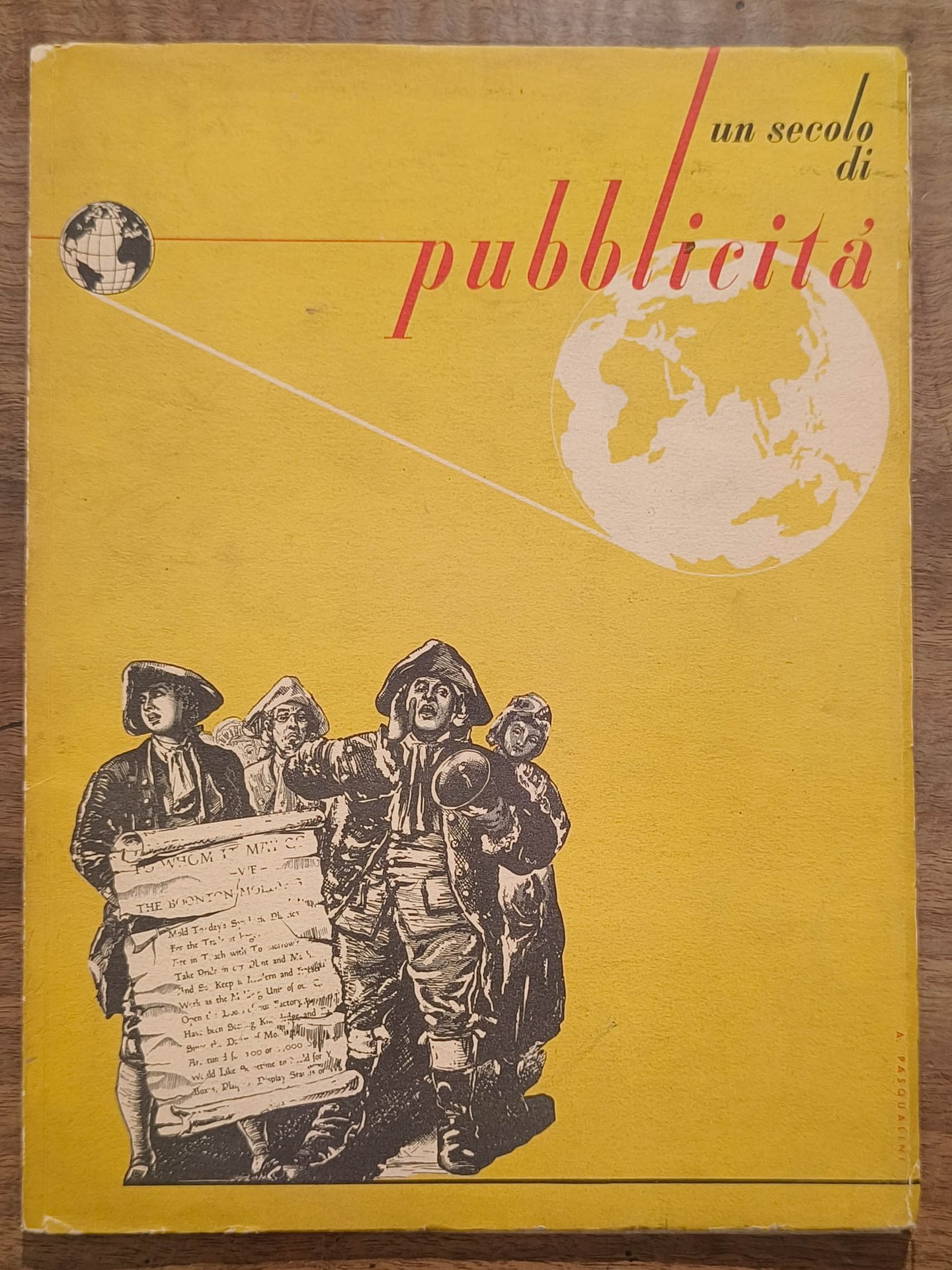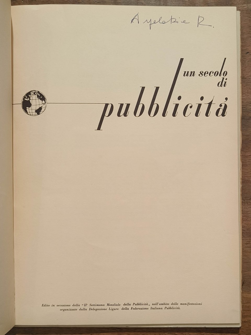 In 4, cm 22 x 29, pp. 52. Brossura editoriale illustrata da Adriano G. Pasqualini, con tavole a colori e immagini applicate. Pubblicazione della delegazione ligure della F.i.p. in occasione della II settimana mondiale della pubblicità. Tormena industrie grafiche, Genova. 1953. Una raccolta di decine di esempi di pubblicità dei maggiori illustratori italiani e stranieri. Leggere usure alla copertina, dorso leggermente aperto, un fascicolo staccato. Firma di appartenenza alla pagina del titolo.