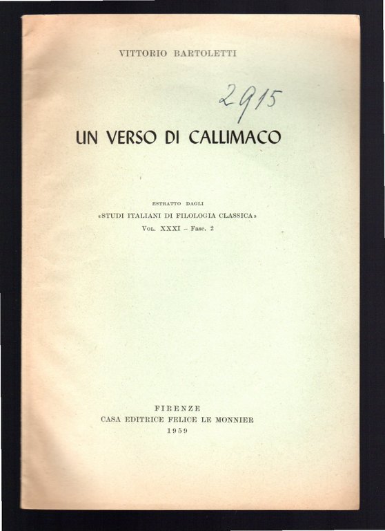 Opuscolo vintage. Estratto dagli "Studi Italiani di Filologia Classica" Vol. XXXI - Fasc. 2. Illustrazioni in bn fuori dal testo. Segno di biro in copertina. Ordinario segno del tempo. Usura da scaffale.