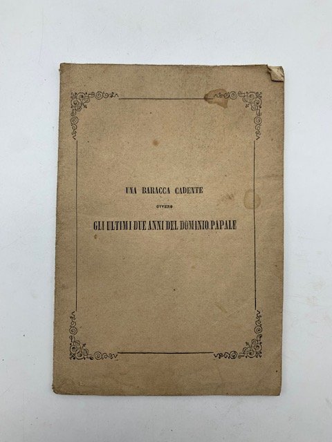 In 16 (cm 12,5 x 18 circa), pp. 40. Goora lieve al margine inferiore bianco delle pagine. Brossura editoriale con due piccoli aloni al piatto anteriore. Commedia scritta da Ettore Colasanti definito al frontespizio "esule romano". Nel testo introduttivo dedicato alla "Generosa Guardia Nazionale Catanese" si legge: "Col triplice scopo di ritrarre un utile alle mie smunte finanze, porgere un breve passatempo ai lettori, e procurare un qualche sollevamento al mio spirito travagliato dal martirio di dodici anni d'esilio, ho voluto abbozzare uno scherzo comico in versi martelliani. Ed avvegnache' fui sempre osteggiatore del Governo papale, sotto cui per mia disgrazia io nacqui, scelsi a soggetto di tale componimento lo stato delle cose di Roma negli ultimi due anni dei grandi avvenimenti italiani, intessendole con episodj bizzarri".