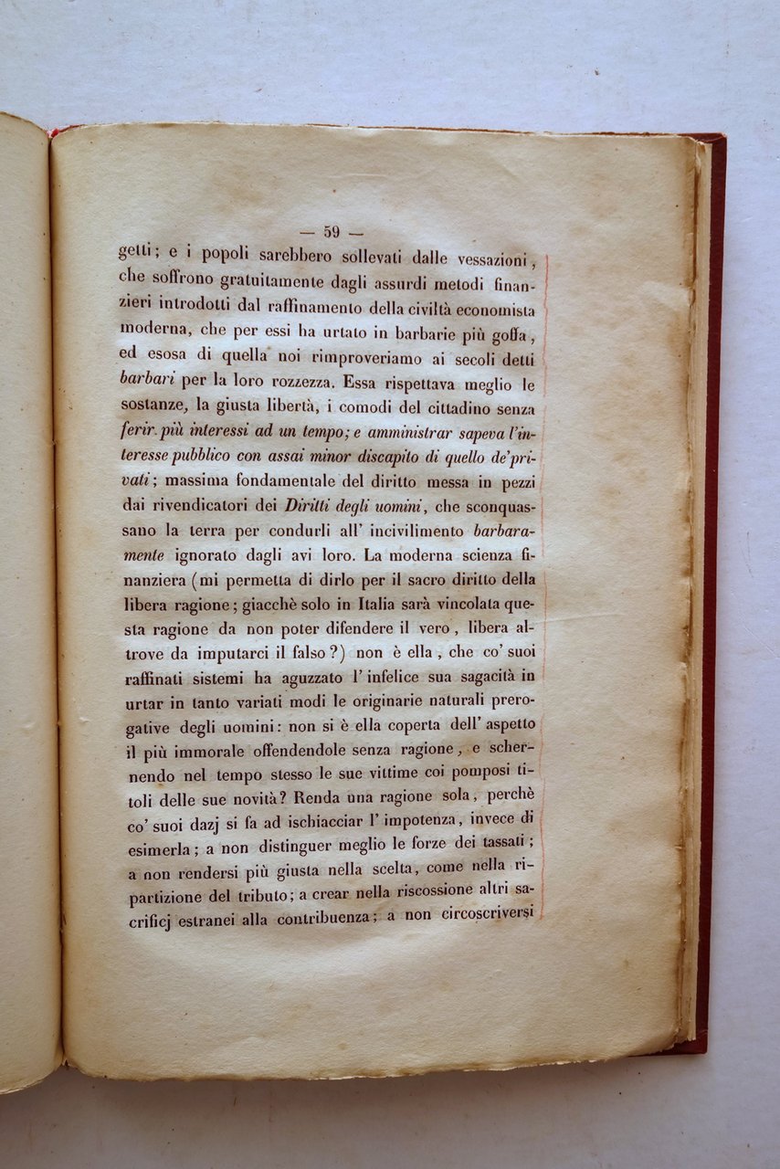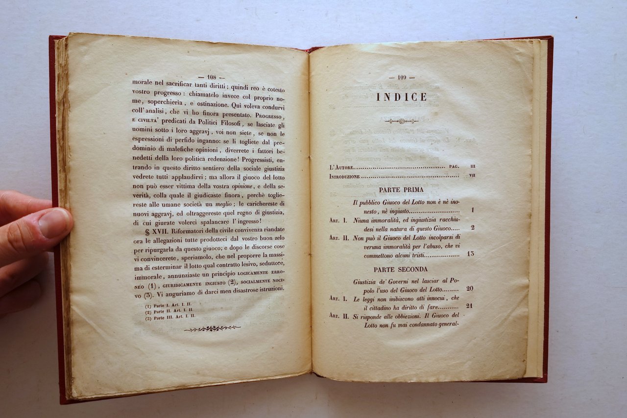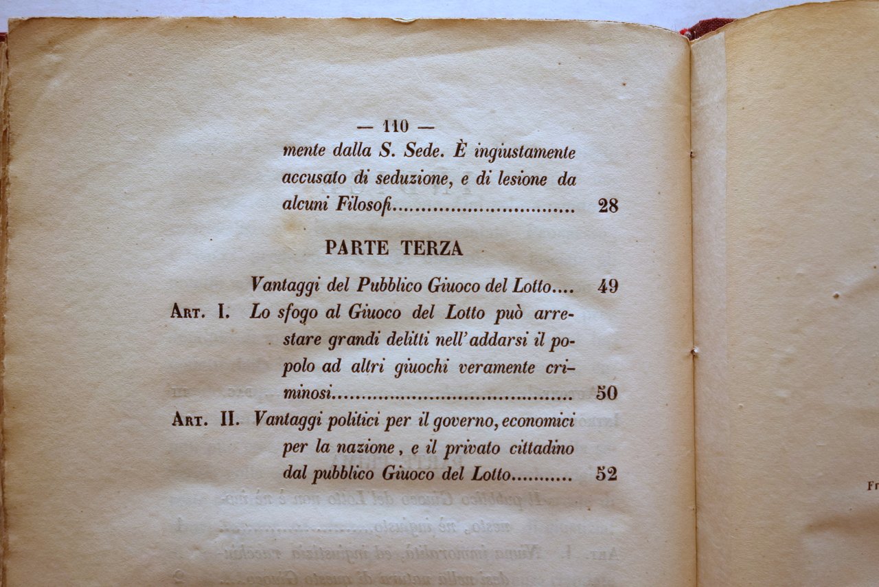 Mario Felice Peraldi, Una causa del popolo ossia giustificazione del pubblico giuoco del lotto di Monsignor Mario Felice Peraldi Dalla Tipografia Salviucci, Roma 1850; cm 23x16; pp. XXIV-112; interni marginosi con barbe; frontespizio con una piccola ill. incisa in b/n. Legatura primonovecentesca in mezza tela muta. Condizioni di conservazione Legatura molto ben conservata con poche minime macchiette e aloni. Interni buoni con alcune piccole leggerissime bruniture; pagina recante il colophon con poche piccole lievi ombre di gore; poche pagine con marginali leggeri segnetti a pastello rosso (vedi foto). Interessante apologia della pratica del lotto. Per ulteriori informazioni vedi foto indice. Molto raro. OPEB.5558 N