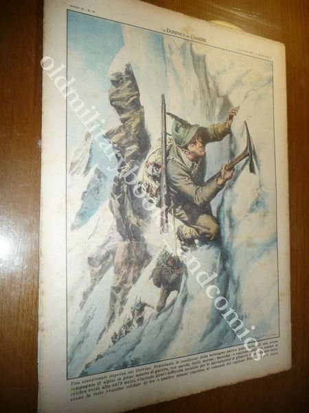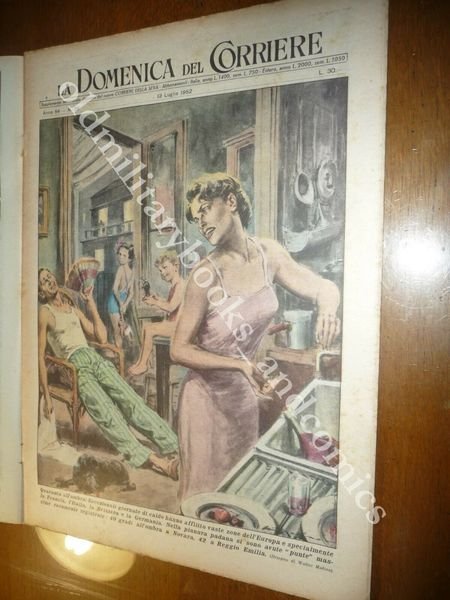 DESCRIZIONE: Domenica del Corriere, Milano, Anno 54 n. 28 (13 LUGLIO 1952). COPERTINA: Una eccezionale ondata di caldo in Europa con punte di 40 gradi. RETRO: Una eccezionale impresa sul Cervino.Una compagnia di alpini in assetto da guerra raggiunge i 4478 metri della vetta. La Domenica del Corriere è stato un popolare settimanale italiano fondato a Milano nel 1899 e chiuso nel 1989. Apparve per la prima volta nelle edicole l'8 gennaio 1899 come supplemento illustrato del Corriere della Sera. Stampata in grande formato (sul modello del domenicale La Tribuna illustrata), aveva 12 pagine e veniva distribuita gratis agli abbonati del Corriere, oppure si poteva acquistare in edicola per 10 centesimi. La prima e ultima di copertina erano sempre disegnate. Il Corriere si avvaleva di un giovane disegnatore, Achille Beltrame, allora sconosciuto, a cui veniva affidato in ogni numero il compito di rendere con la sua tavola il fatto più interessante della settimana. Dopo la sua morte nel 1945, fu sostituito da Walter Molino che, come il suo predecessore, firmò memorabili copertine. A differenza dei settimanali dell'epoca, la Domenica del Corriere diede ampio spazio alle fotografie e ai disegni, e questo fu uno dei motivi del suo successo. CONDIZIONI: Buone con azzurrina. PESO / WEIGHT: 200 gr. without package