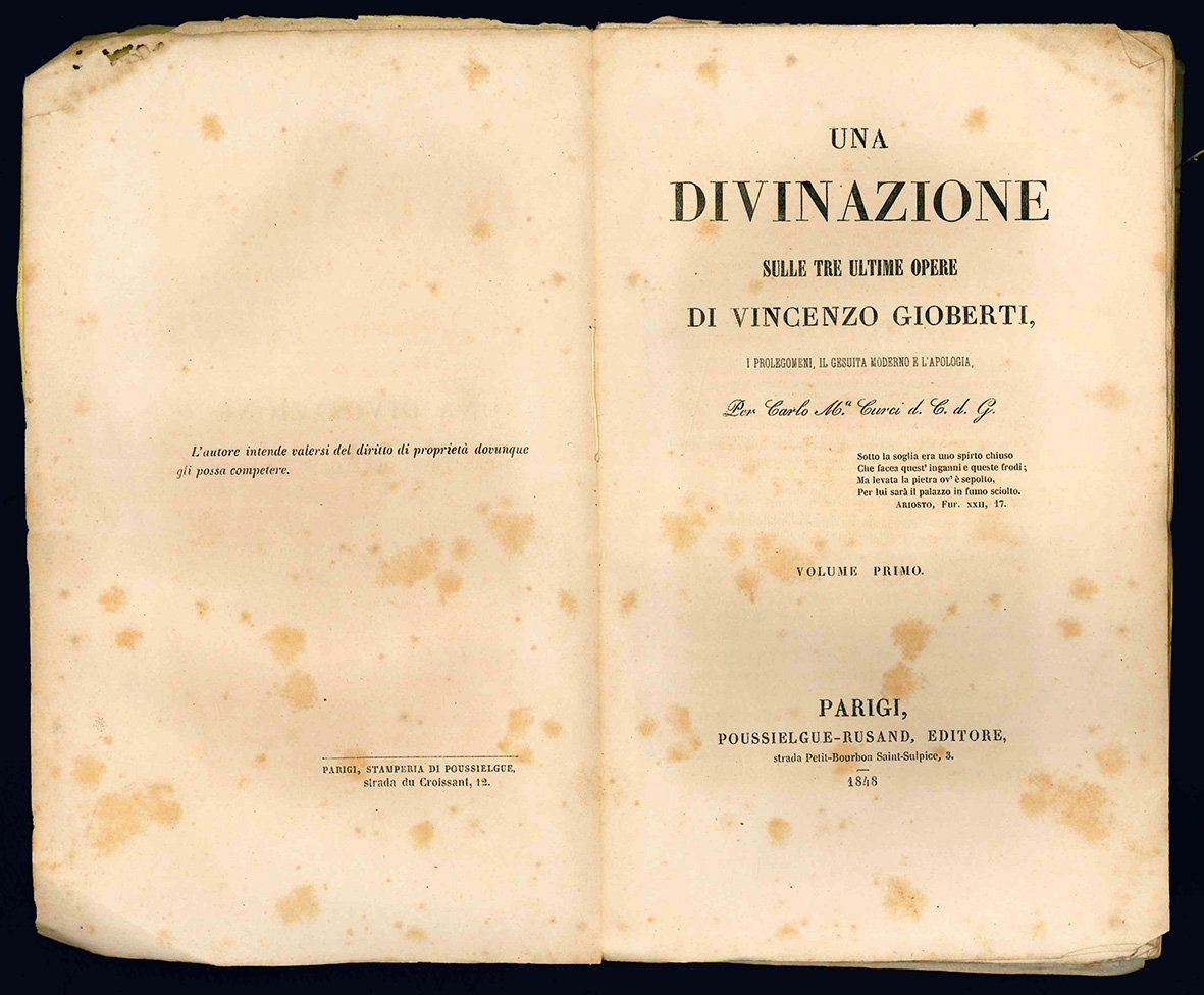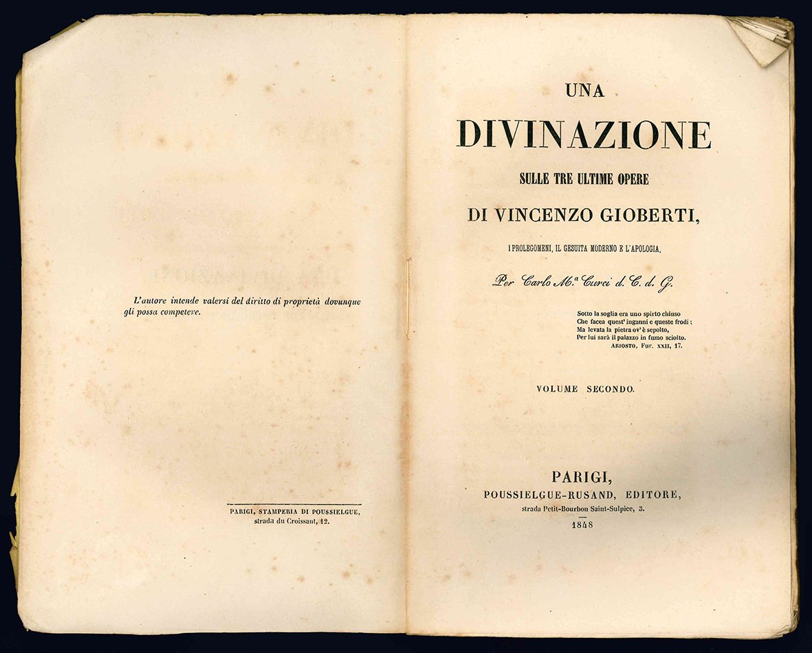 Una divinazione sulle tre ultime opere di Vincenzo Gioberti, I Prolegomeni, Il gesuita moderno e L'apologia, per Carlo M. Curci d. C. d. G. Volume primo [-secondo].