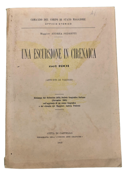 In 4° (24x16,2 cm); VII, (1), 47 pp. e tre c. di tav. delle quali, un ritratto e due grandi tavole più volte ripiegate rappresentanti l'itinerario del viaggio di Pedretti in Cirenaica. Prima edizione, in forma singola, di questo articolo già apparso sul Bollettino della Società Geografica Italiana nel novembre del 1908. Dedica autografa della vedova e del fratello di Pedretti ad un noto professore universitario. L'opera contiene anche, una biografia del maggiore Andrea Pedretti. Esemplare in buone-ottime condizioni di conservazione.