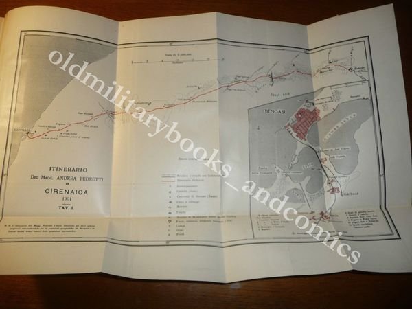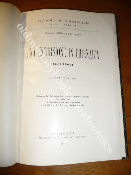 TITOLO: UNA ESCURSIONE IN CIRENAICA NEL 1901 (APPUNTI DI VIAGGIO) Ristampa dal Bollettino della Societa' geografica italiana (Novembre 1903) coll'aggiunta di un cenno biografico e del ritratto del Maggiore Andrea Pedretti? DESCRIZIONE: Tipografia dell'Unioni Arti Grafiche Città di Castello 1913, rilegatura d'epoca, cop. originale non conservata, pp. 47 in 8° con alcune ill. b/n f.t. 2 carte geografiche rip. a fine volume, con gli itinerari percorsi. Riedizione della relazione di questo viaggiatore italiano nato a Parma nel 1847 e morto nel 1903. CONDIZIONI: Ottime. PESO / WEIGHT: 294 gr. without package
