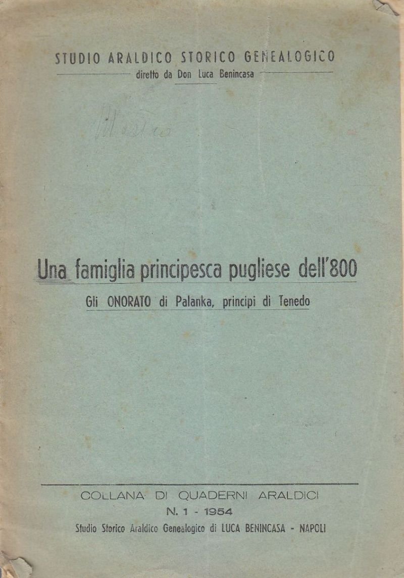 UNA FAMIGLIA PRINCIPESCA PUGLIESE DELL’ 800 GLI ONORATO DI PALANKA PRINCIPI DI TENEDO Studio araldico storico genealogico. Luca Benincasa 195419 Pagine alcune illustrazioni in b/n Copertina editoriale in brossura Dimensioni: 17,5 x 25 cm Stato di conservazione: buono