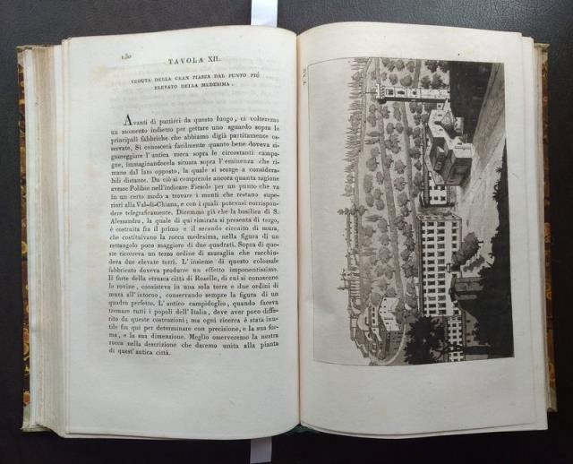 Tipografia Luigi Pezzati, Firenze, 1826. In 8vo, doppio front. e testo italiano / francese a fronte, pp. XLV, 297 (con Indice), alcune antiche iscrizioni riportate nel testo, completo delle 20 vedute f. t. incise all'acquatinta e delle 6 tavole rip. f. t. (di cui alcune ancora all'acquatinta), contropiatti e fogli di guardia in carta celestina, leg. orig. con dorso in pelle, titoli e fregi in oro, piatti in cartone marmorizz. con piccole punte in pergamena. Bell'esemplare in solida ed elegante legatura, ottime le belle incisioni. .