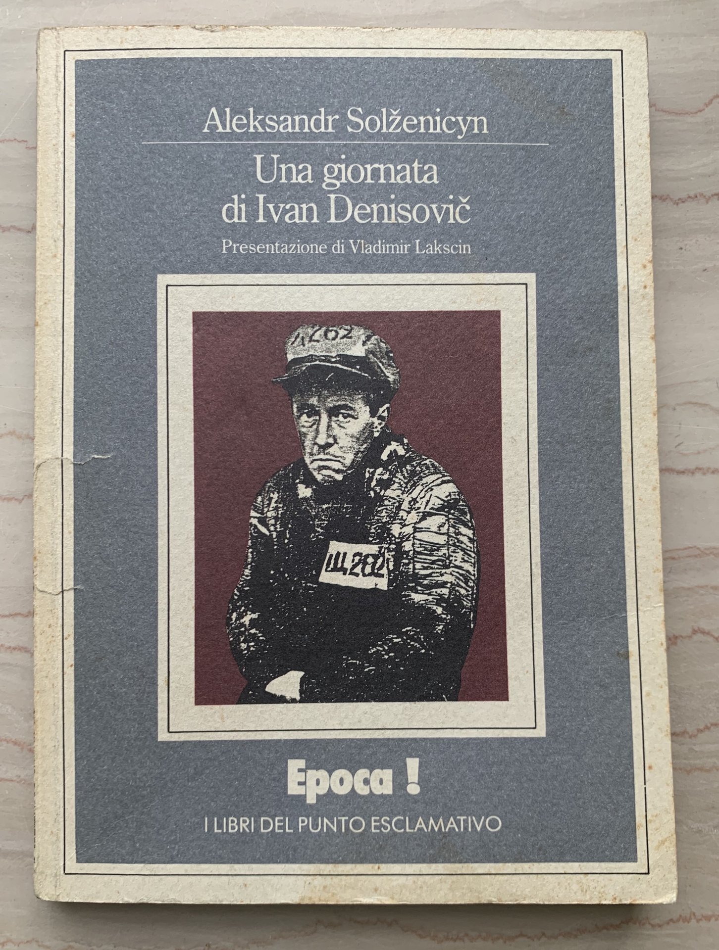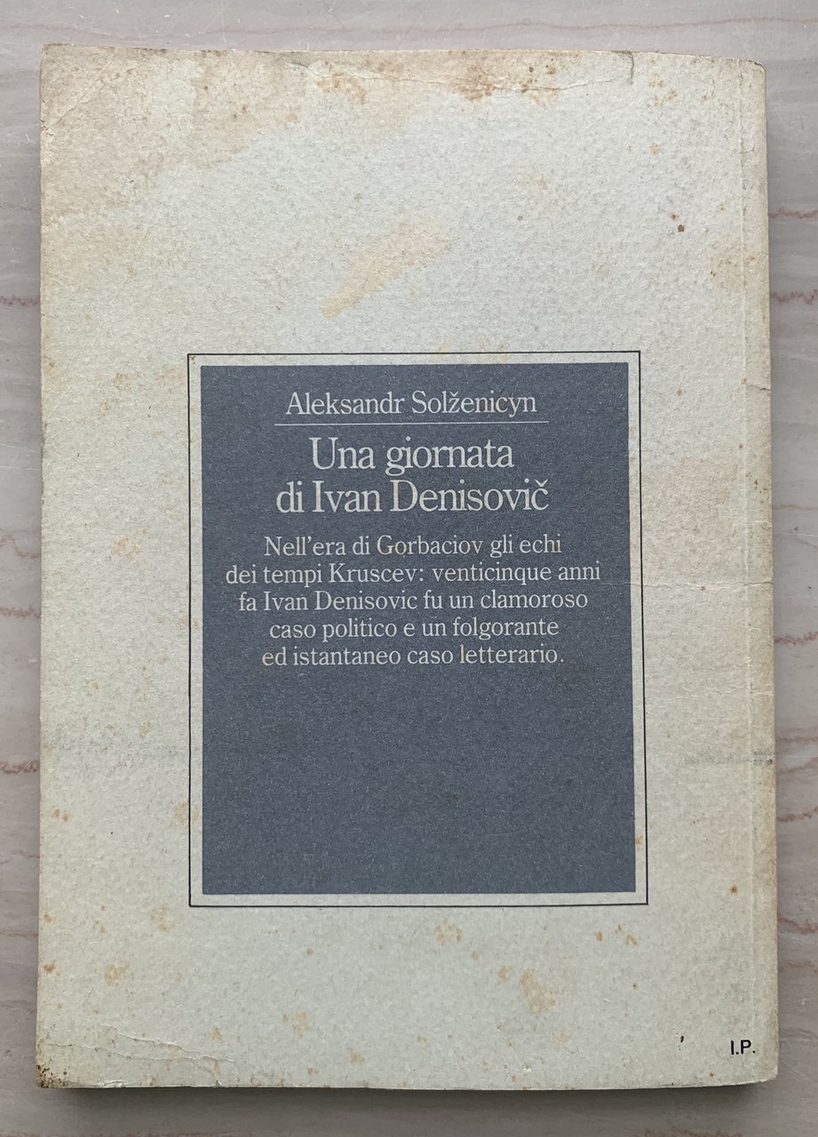 ed. speciale fuori commercio per i lettori di Epoca. Allegato a Epoca n. 1992 del 5-12-1988, Direttore responsabile: Alberto Statera (ed. originale: 18 novembre 1962 sulla rivista letteraria sovietica Novyj Mir (World copyright © 1962-73 by Aleksander Solschenitžy - I traduzione dal russo: pubblicata nel 1962 dal settimanale L'Espresso. Titolo originale: Odin den Ivana Denisovica - Per la traduzione © 1963 Giulio Einaudi editore s.p.a., Torino). Collana I libri del punto esclamativo. XVI/X+5-148+(6)=160/brossura in cartoncino bianco ruvido (In copertina: Foto segnaletica di Solženicyn durante la detenzione nel lager speciale. Grafic: Crew Italia Ass.. Stato buono (leggera usra della copertina ai margini - copertina brunita e con fioriture - pagine brunite).