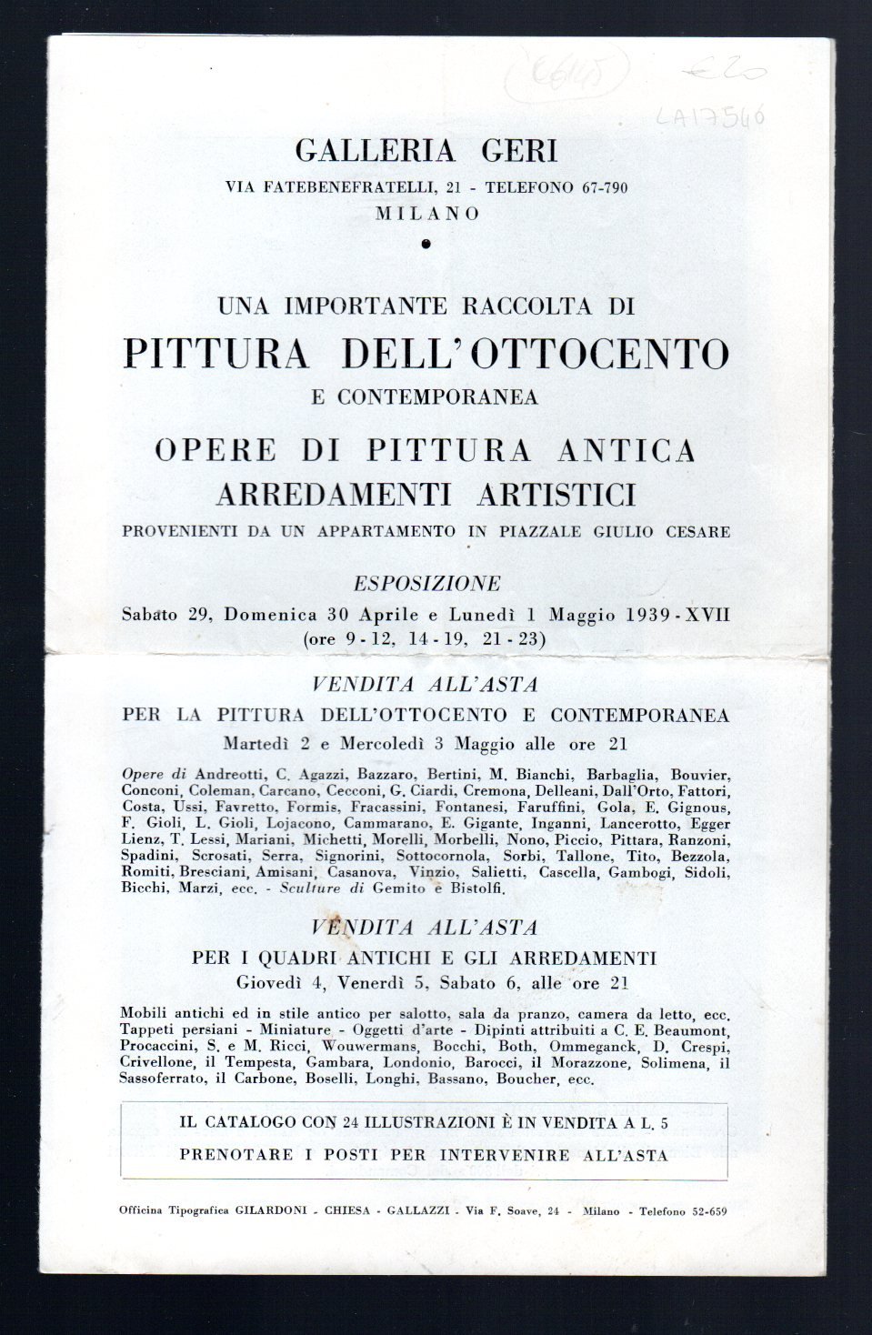 Pieghevole d'arte vintage della mostra, Milano, 29-30 aprile e 1° maggio 1939. Illustrazioni in bn fuori dal testo. Strappo e pieghe centrali.