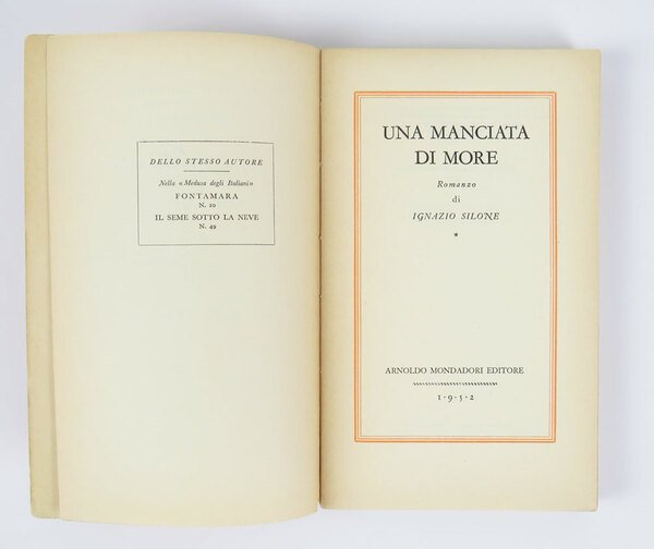 LIBROEdizione originale.Brossura con piccola mancanza alla testa del dorso e lieve gora al piede, per il resto normali, non deturpanti, segni d’usura. Carte e tagli leggermente bruniti. Primo romanzo pubblicato da Silone nel dopoguerra, a seguito delle numerose ristampe italiane dei suoi capolavori antifascisti. Luce D’Eramo segnala che il libro toccava quota ventunmila copie con l’edizione del 1971 e venne tradotto in dieci lingue entro i primi tre anni dall’edizione originale.D’Eramo, Ignazio Silone (Roma 2014), pp. 258-9
