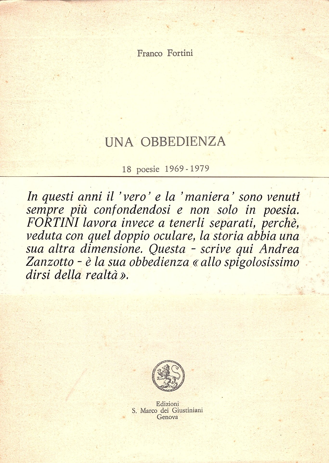 In-8°, pp. 67, (5), brossura editoriale con sovraccoperta e fascetta. Riproduzione di un'acquaforte di Morlotti a p. pag. Ottimo esemplare entro velina. Prima edizione. Prefazione di Andrea Zanzotto. Quaderni di poesia. Spaducci, p. 130. Gambetti / Vezzosi, pp. 355-356.