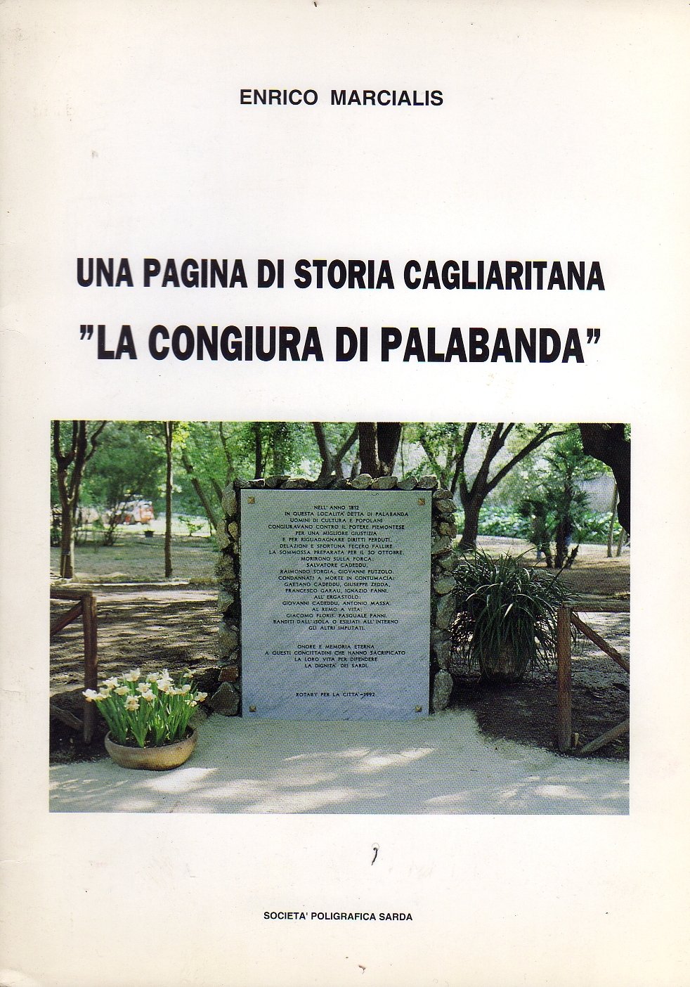 Un volumetto (cm 24 x 17); pp. 24; leg. in brossura ed. in cartoncino lucido bianco con titolo a caratteri neri, illustrato al piatto ant. con la foto a colri della lapide che ricorda i caduti della congiura di Palabanda (avvenuta nel 1812); ill.ne in b/n a doppia pagina riportante una porzione della mappa di Cagliari ai primi dell'800, nella zona della Valle di Palabanda e dintorni; pubblicazione del Rotary per la città, in collaborazione con il Banco di Sardegna; opera di particolare interesse per la storia locale sarda. Rif.: IT\ICCU\CAG\0024435. Cond.: in condizioni generali molto buone.