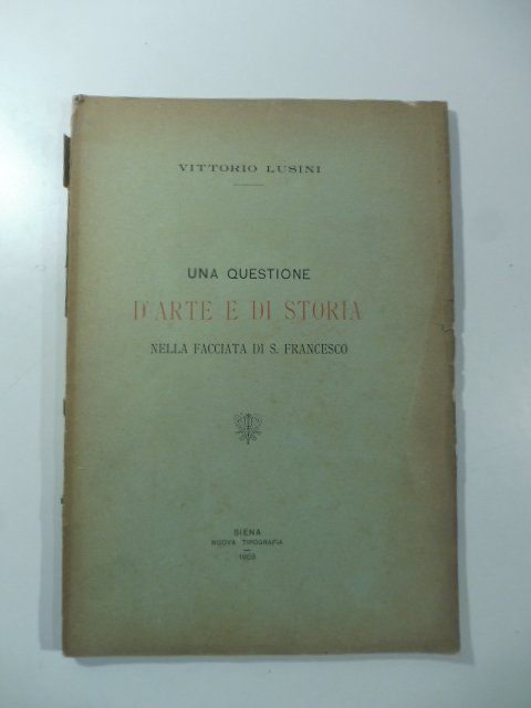 In 8, cm. 17 x 24,3, pp. 80 + (4), brossura editoriale. Danni riparati al dorso, taglietti al margine esterno del piatto anteriore. Indice: Da un tempo all'altro; I restauri di S.Francesco; Concorsi e disegni; Si puo' o non si puo'; Unita' di concetto e disegno nella costruzione di S. Francesco; E' probabile un concetto di facciata del Rinascimento di S. Francesco?; Come intesero la facciata al compimento della fabbrica di S. Francesco; La porta del San Francesco e' fatta per li'?; L'oranemnto della porta di S. Francesco e' un accozzo frammentario; Conclusione.