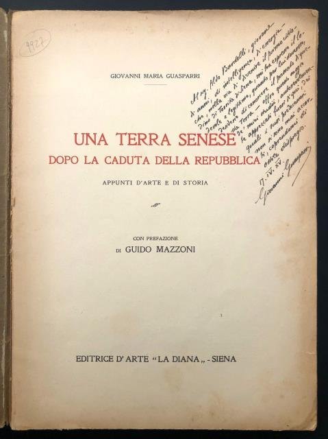 Casa Editrice D'Arte "La Diana". Estratto dalla Rassegna "La Diana", Anno VII - Fasc. III – 1932. Impresso nello Stabilimento Tipografico Ex – Combattenti - Siena (in fine volume al verso dell'ultima bianca). Con Prefazione di Guido Mazzoni. In 4to grande, front. in rosso / nero, pp. 26, con ill. fot. e alcune altre immaginette. Saggio che omaggia la "fedelissima" di Siena e alcuni dei nomi ad essa legati, tra cui quello di Francesco Vanni, di cui la cittadina conserva, nella Chiesa della SS. Annunziata, una bellissima "Annunciazione". Al frontespizio fitta, lunga e bella dedica dell'Autore con data 17.IV. XV. al sig. Giovanni Bandelli "giovane di anni, di intelligenza, di energia", bross. orig. in carta marroncina con titoli in rosso / nero. Pagine scollate e sciolte dal dorso, un leggero arricciamento degli angoli ma interno ben conservato.