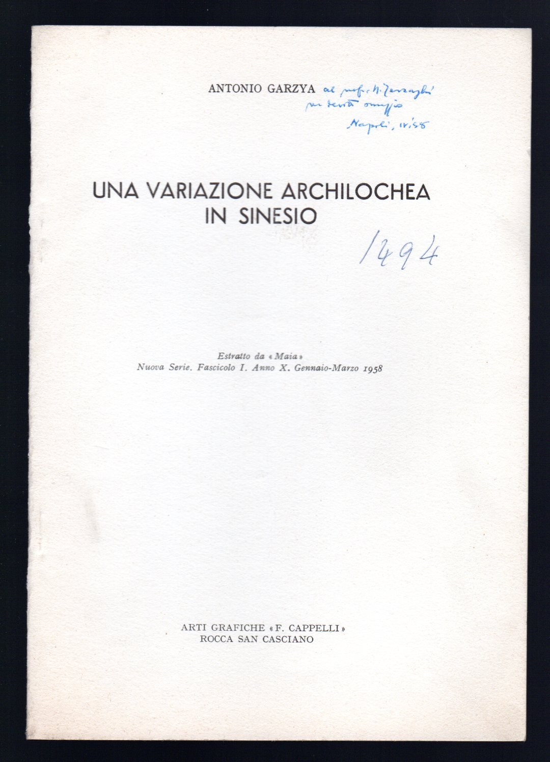 Opuscolo vintage. Estratto da "Maia" Nuova Serie. Fascicolo I. Anno X. Gennaio-Marzo 1958. Dedica autografa. Segni di biro in copertina. Usura da scaffale. Ordinario segno del tempo.