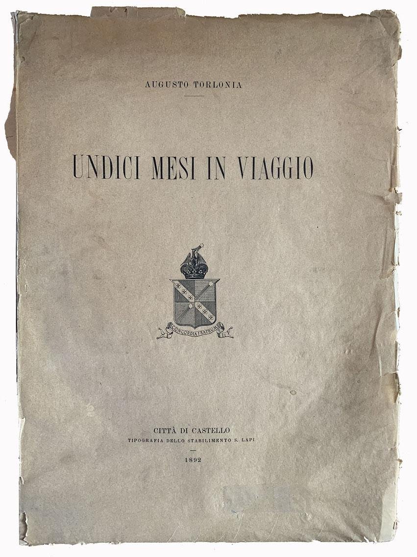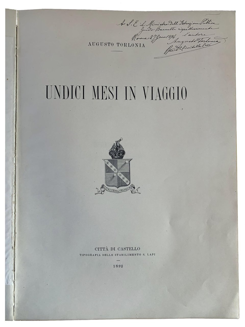 In 4to (mm 355x255); pp. [10], 151, [1], 98 c. di tav. illustrate. Numerose illustrazioni fotografiche in bianco e nero all'interno del testo. Novantotto illustrazioni a piena pagina fuori testo. Ritratto a mezzo busto dell'autore in antiporta protetta da velina. Dedica dell'autore al frontespizio datata 1894 "A. S. E. il Ministro dell'Istruzione Pubblica Guido Baccelli rispettosamente, l'autore Augusto Torlonia..... Roma 27 gennaio 1894." Brossura muta con sovracoperta leggera riportante il titolo al piatto anteriore e al dorso. Lievi mancanze ai margini dei piatti e importante mancanza al dorso. Tassello cartaceo riportante la collocazione al dorso. Esemplare n. 177 di edizione numerata di ignota tiratura.Resoconto di viaggio di don Augusto Torlonia in America del Nord ed Estremo oriente.
