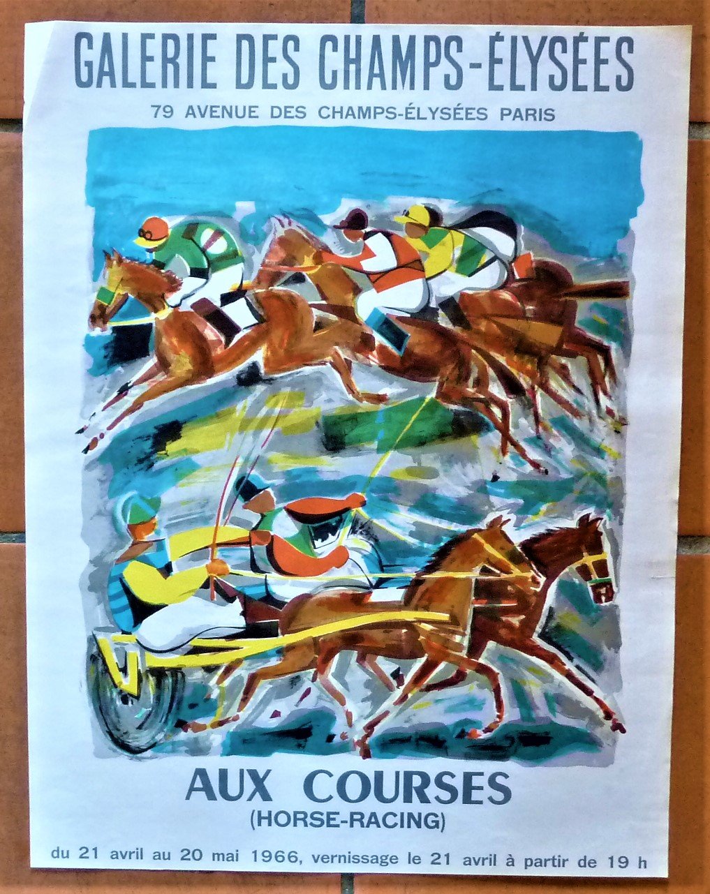 Une affiche éditée à l'occasion de l'exposition "Aux Courses, Horse-Racing", à la Galerie des Champs-Elysées du 21 avril au 20 mai 1965.