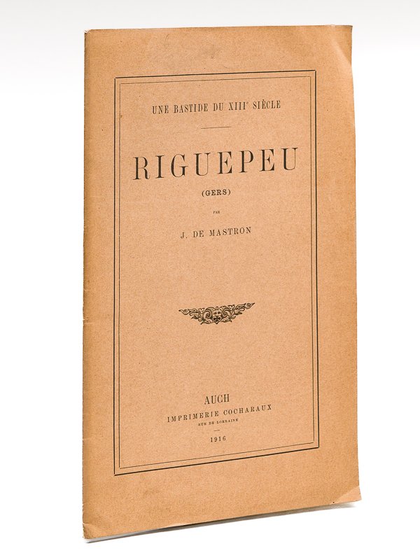 1 brochure in-8, Imprimerie Cocharaux, Auch, 1916, 18 pp. Rare exemplaire de l'édition originale de cette étude savante consacrée à la bastide de Riguepeu dans le Gers, sur la route entre Vic-Fezensac et Montesquiou. Bon exemplaire